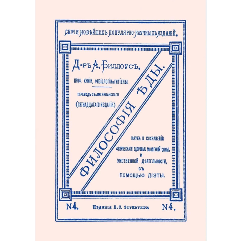 Репринтное издание. С.-Петербург. Издание В. С. Эттингера, Казанская, 44, 1895. Перевод с пятнадцатого американского издания д-ра М.А. Раскиной. (Phylosophy of eating, a science of preserving health, muscle strength and mental labour by means of diet). Д-р А Биллоус - профессор химии, физиологии и гигиены. Книга изготовлена по технологии "печать по требованию". Тираж 30 экз.