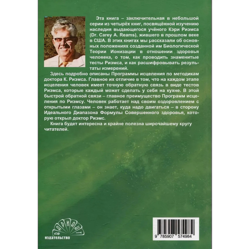 Эта книга заключительная в небольшой серии из четырёх книг, посвящённой изучению наследия выдающегося учёного Кэри Риэмса (Dr. Carey A. Reams), жившего в прошлом веке в США. В этих книгах мы рассказали об основных положениях созданной им Биологической Теории Ионизации в отношении здоровья человека,о том, как проводить знаменитые тесты Риэмса, и как расшифровывать результатыизмерений. Далее возникает вопрос а что же делать человеку, который уже понял, какиеу него проблемысо здоровьем после расшифровки теста? Об этом рассказывается в этой книге. Здесь подробно описаны программы исцеления по методикам доктора К. Риэмса. Эти программы могут показаться незамысловатыми на первый взгляд правильное питание, правильное употребление воды, некоторых особенных минеральных добавок, разработанных самим доктором К. Риэмсом, правильный режим дня, движение, очистка толстой кишки и пр. Но! На каждом этапе исцеления человек имеет точную обратную связь в виде тестов Риэмса, которые каждый может сделать у себя на кухне. В этой быстрой обратной связи главное преимущество программ исцеления по Риэмсу. Человек работает над своим оздоровлением с открытыми глазами он знает, куда надо двигаться в сторону Идеального ДиапазонаФормулы Совершенного здоровья. Книга будет интересна и крайне полезна широчайшему кругу читателей.