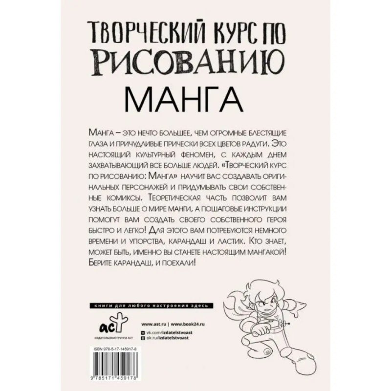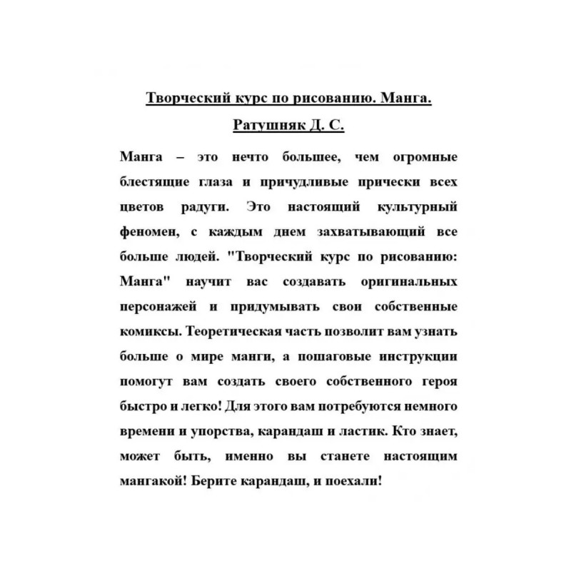 Творческий курс по рисованию. Манга. Ратушняк Д. С. Манга это нечто большее, чем огромные блестящие глаза и причудливые прически всех цветов радуги. Это настоящий культурный феномен, с каждым днем захватывающий все больше людей. "Творческий курс по рисованию: Манга" научит вас создавать оригинальных персонажей и придумывать свои собственные комиксы. Теоретическая часть позволит вам узнать больше о мире манги, а пошаговые инструкции помогут вам создать своего собственного героя быстро и легко! Для этого вам потребуются немного времени и упорства, карандаш и ластик. Кто знает, может быть, именно вы станете настоящим мангакой! Берите карандаш, и поехали!