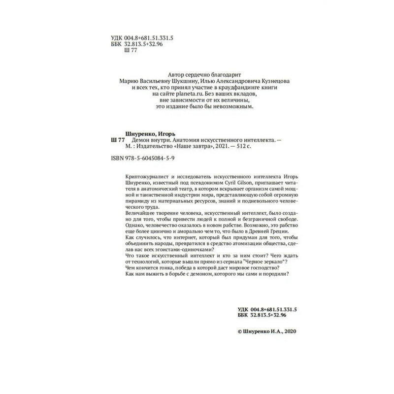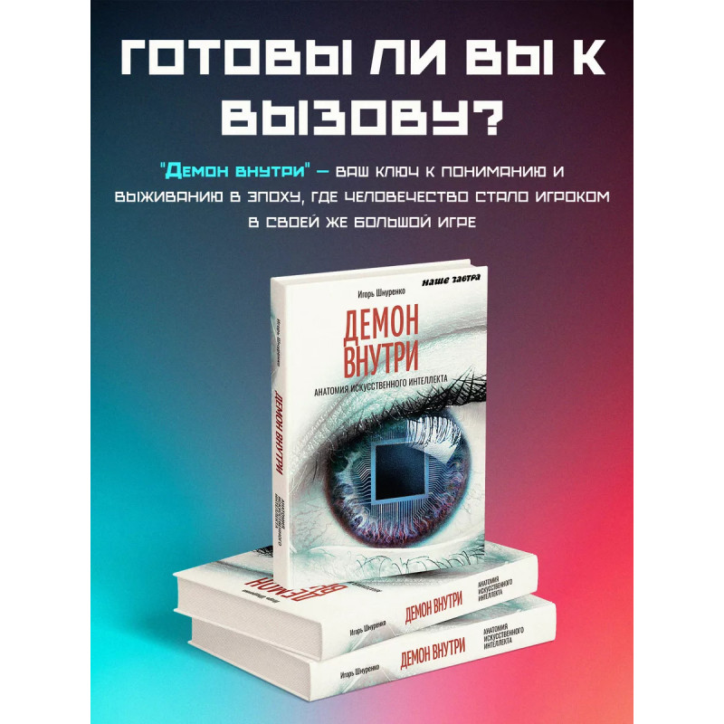 Демон внутри. Анатомия искусственного интеллекта. Криптожурналист и исследователь искусственного интеллекта Игорь Шнуренко, известный под псевдонимом Cyril Gilson, приглашает читателя в анатомический театр, в котором вскрывает организм самой мощной и таинственной индустрии мира, представляющую собой огромную пирамиду из материальных ресурсов, знаний и подневольного человеческого труда. Величайшее творение человека, искусственный интеллект, было создано для того, чтобы привести людей к полной и безграничной свободе. Однако, человечество оказалось в новом рабстве. Возможно, это рабство еще более цинично и аморально чем то, что было в Древней Греции. Как случилось, что интернет, который был придуман для того, чтобы объединить народы, превратился в средство атомизации общества, сделав нас всех эгоистами-одиночками? Что такое искусственный интеллект и кто за ним стоит? Чего ждать от технологий, которые вышли прямо из сериала Черное зеркало ?