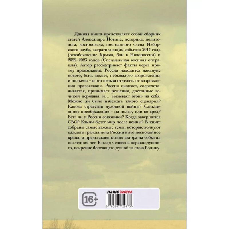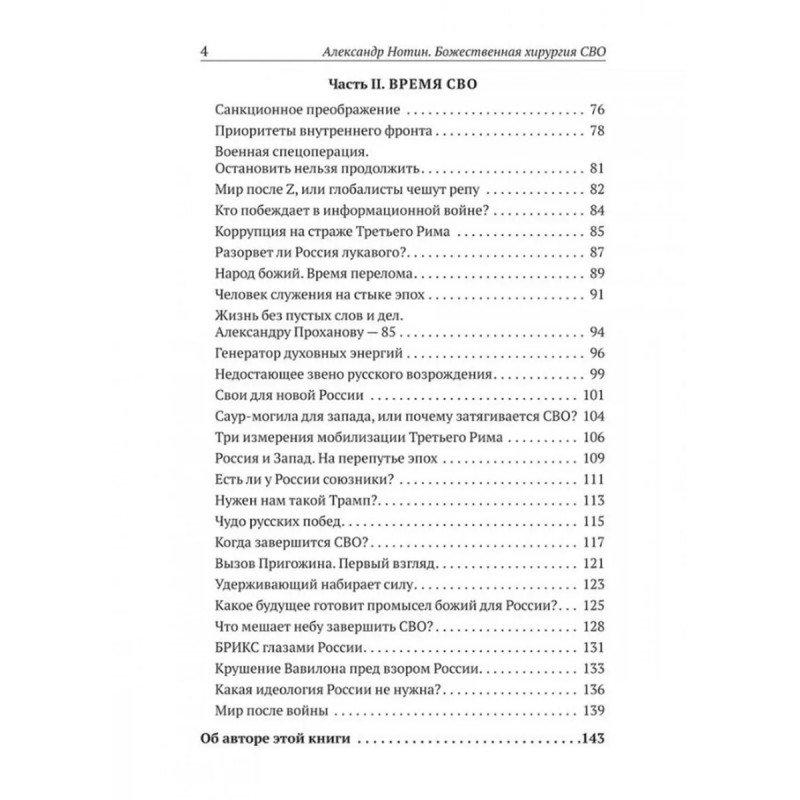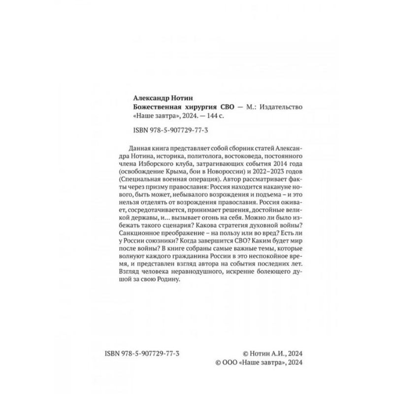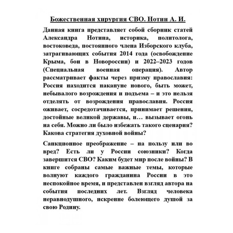 Божественная хирургия СВО. Нотин А.И. Данная книга представляет собой сборник статей Александра Нотина, историка, политолога, востоковеда, постоянного члена Изборского клуба, затрагивающих события 2014 года (освобождение Крыма, бои в Новороссии) и 20222023 годов (Специальная военная операция). Автор рассматривает факты через призму православия: Россия находится накануне нового, быть может, небывалого возрождения и подъема и это нельзя отделять от возрождения православия. Россия оживает, сосредотачивается, принимает решения, достойные великой державы, и вызывает огонь на себя. Можно ли было избежать такого сценария? Какова стратегия духовной войны?Санкционное преображение на пользу или во вред? Есть ли у России союзники? Когда завершится СВО? Каким будет мир после войны? В книге собраны самые важные темы, которые волнуют каждого гражданина России в это неспокойное время, и представлен взгляд автора на события последних лет. Взгляд человека неравнодушного, искренне болеющего душой за свою Родину.