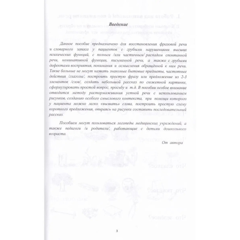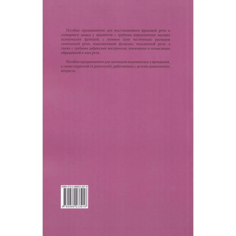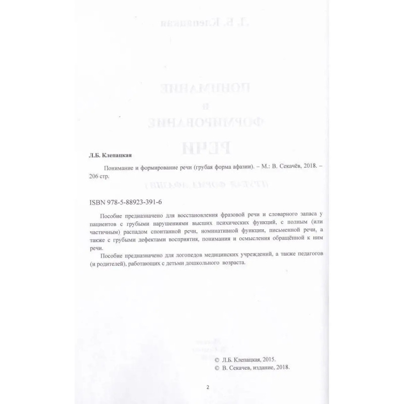 Понимание и формирование речи (грубая форма афазии). ISBN 9785-88923-3916. Понимание и формирование речи (грубая форма афазии). Клепацкая Л. Б. Пособие предназначено для восстановления фразовой речи и словарного запаса у пациентов с грубыми нарушениями высших психических функций, с полным (или частичным) распадом спонтанной речи, номинативной функции, письменной речи, а также с грубыми дефектами восприятия, понимания и осмысления обращенной к ним речи. Пособие предназначено для логопедов медицинских учреждений, а также педагогов (и родителей), работающих с детьми дошкольного возраста.