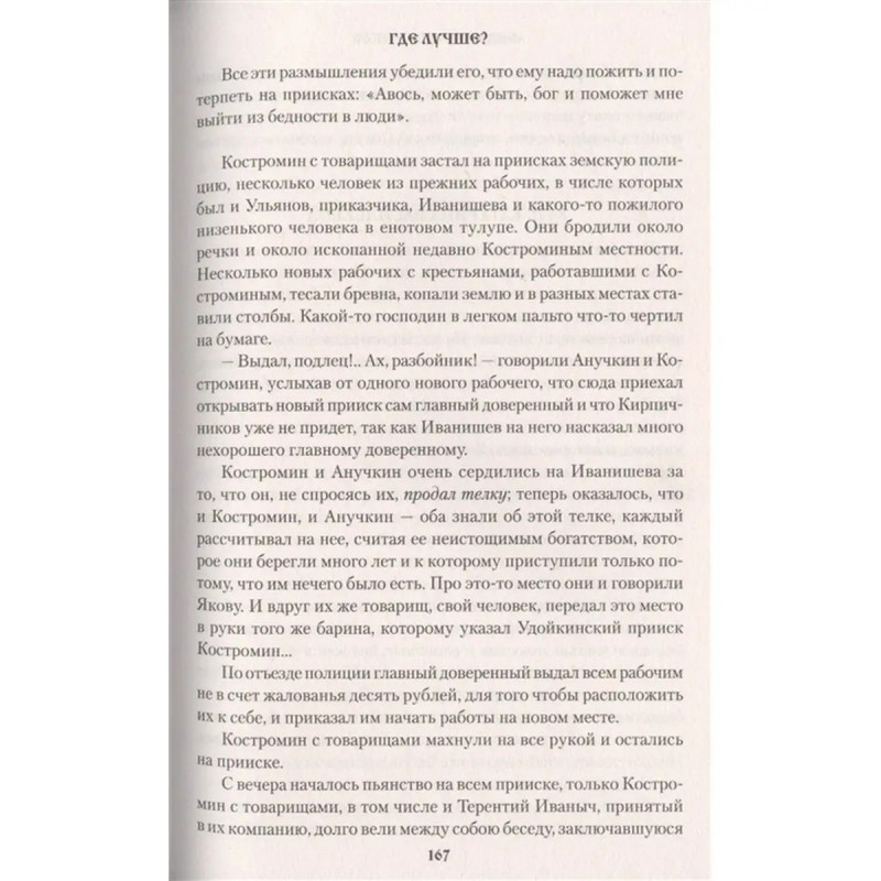 Где лучше?. В конце 60-х начале 70-х годов XIX века творчество Федора Михайловича Решетникова (1841-1871) оказалось в центре внимания русской критики. Не было, пожалуй, ни одного журнала, который не откликнулся бы так или иначе на его романы. "Где лучше?" самое значительное произведение писателя. Множество действующих лиц, порой возникающих на минуту, составляют его основу. Где-нибудь на Никольском рынке, на барках, на заводах Обводного канала и Охты вершится такое, что самого истого героя романа внезапно перевернет вверх дном и погонит в ту или иную сторону. Но не курьезные случаи, а общечеловеческая драма, называемая борьбою за существование, дала содержание роману Решетникова, в котором, по словам М. Е. Салтыкова-Щедрина, "главным действующим лицом и главным типом является целая народная среда".