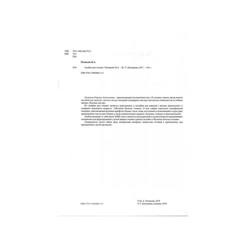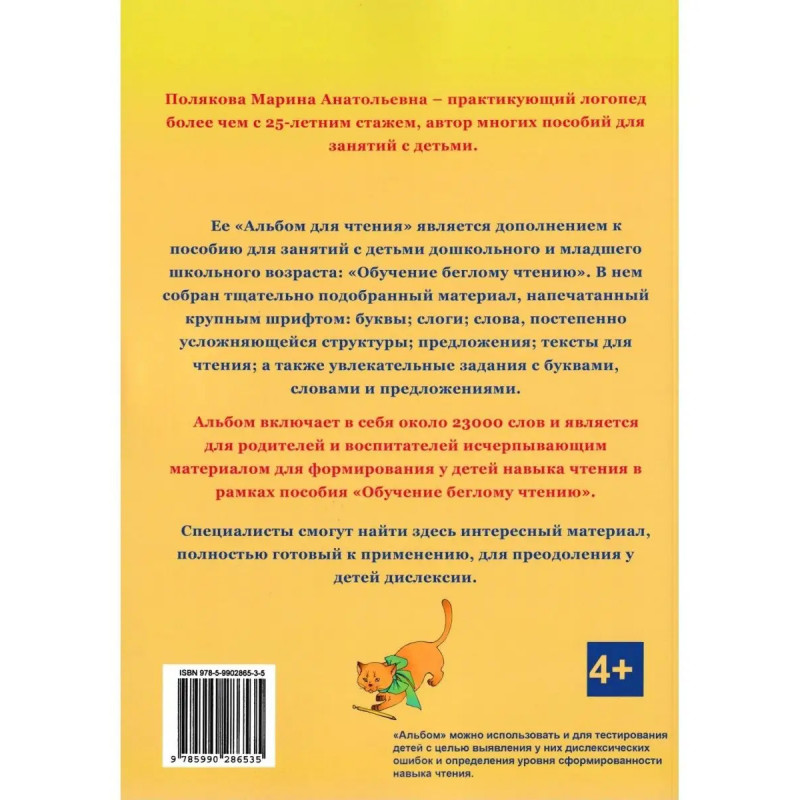 Альбом для чтения. Приложение к пособию "Обучение беглому чтению". Полякова М. А.Полякова Марина Анатольевна - практикующий логопед более чем с 25-летним стажем, автор многих пособий для занятий с детьми, автор и ведущий семинаров и мастер-классов для специалистов в учебном центре "Логопед-мастер". Ее "Альбом для чтения" является дополнением к пособию для занятий с детьми дошкольного и младшего школьного возраста. "Обучение беглому чтению". В нем собран тщательно подобранный материал, напечатанный крупным шрифтом: буквы; слоги; слова, постепенно усложняющейся структуры; предложения; тексты для чтения; а также увлекательные задания с буквами, словами и предложениями. Альбом включает в себя около 23000 слов и является для родителей и воспитателей исчерпывающим материалом для формирования у детей навыка чтения в рамках пособия "Обучение беглому чтению"(Артикул пособия: 148390900)