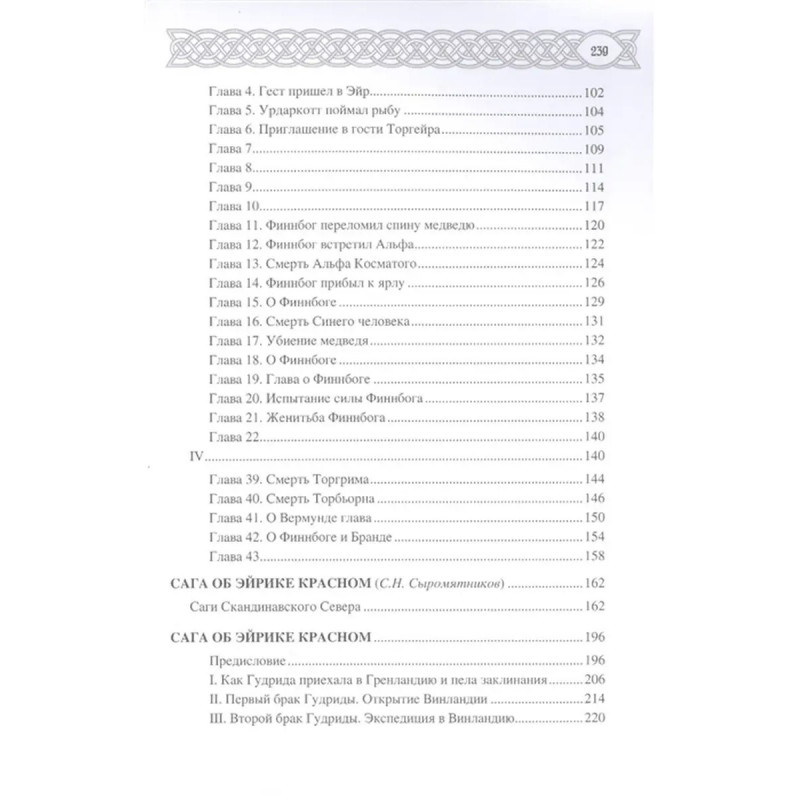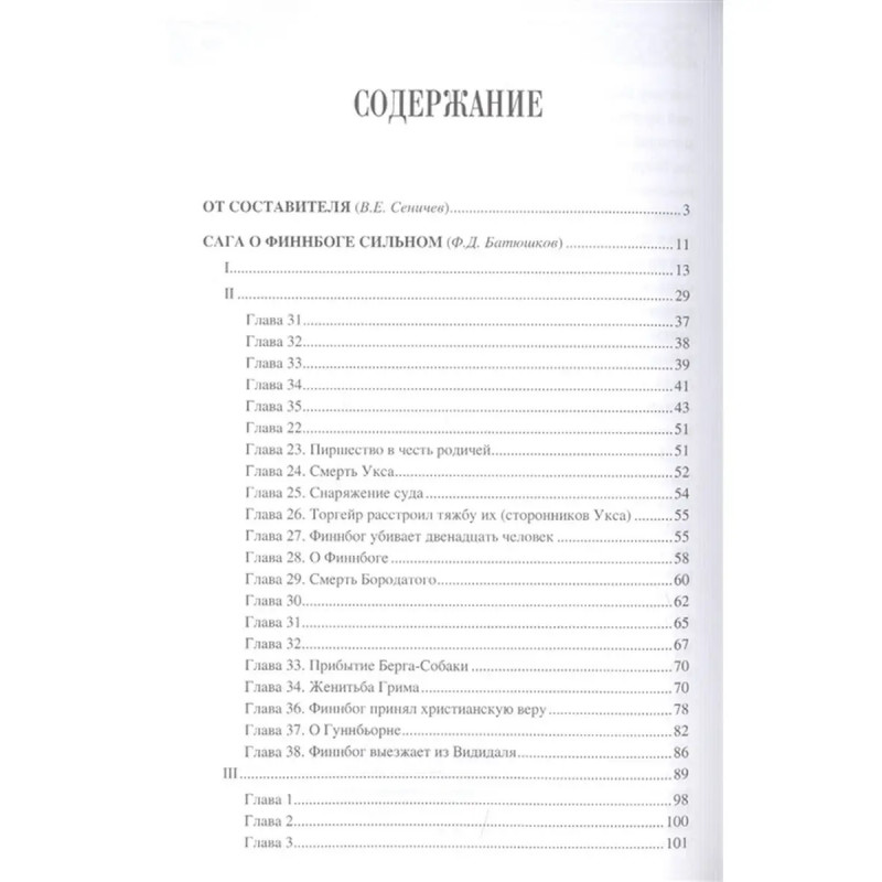 ISBN 9785448434884. В эту книгу вошли пионерские работы, созданные одними из первых отечественных скандинавистов Ф. Д. Батюшковым иС. Н. Сыромятниковым: переводы иисследования "Саги оФиннбоге Сильном" и"Саги об Эйрике Красном". Относящиеся кэпохе заселения Исландии, подробно повествующие онравах ижизненном укладе скандинавов, они могут считаться своего рода энциклопедией быта первых обитателей острова. Тексты представлены всовременной орфографии иснабжены комментариями составителя.