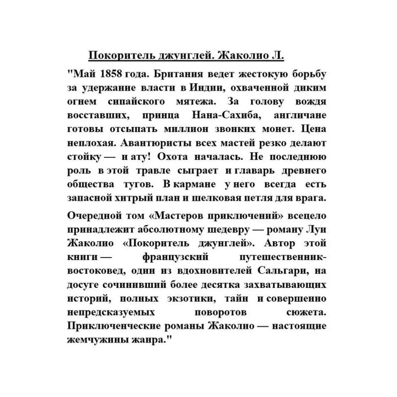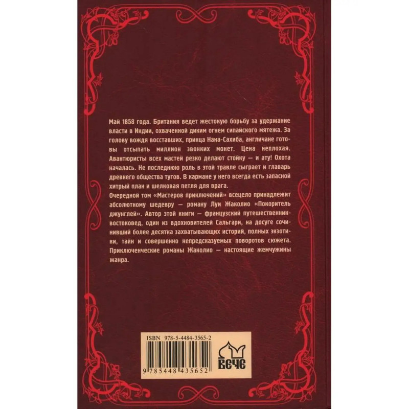 ISBN 9785-4484-35652. Покоритель джунглей. Жаколио Л. Покоритель джунглей. Жаколио Л. "Май 1858года. Британия ведет жестокую борьбу за удержание власти вИндии, охваченной диким огнем сипайского мятежа. За голову вождя восставших, принца Нана-Сахиба, англичане готовы отсыпать миллион звонких монет. Цена неплохая. Авантюристы всех мастей резко делают стойку иату! Охота началась. Не последнюю роль вэтой травле сыграет иглаварь древнего общества тугов. Вкармане унего всегда есть запасной хитрый план ишелковая петля для врага. Очередной том "Мастеров приключений" всецело принадлежит абсолютному шедевру роману Луи Жаколио "Покоритель джунглей". Автор этой книги французский путешественник-востоковед, один из вдохновителей Сальгари, на досуге сочинивший более десятка захватывающих историй, полных экзотики, тайн исовершенно непредсказуемых поворотов сюжета. Приключенческие романы Жаколио настоящие жемчужины жанра.