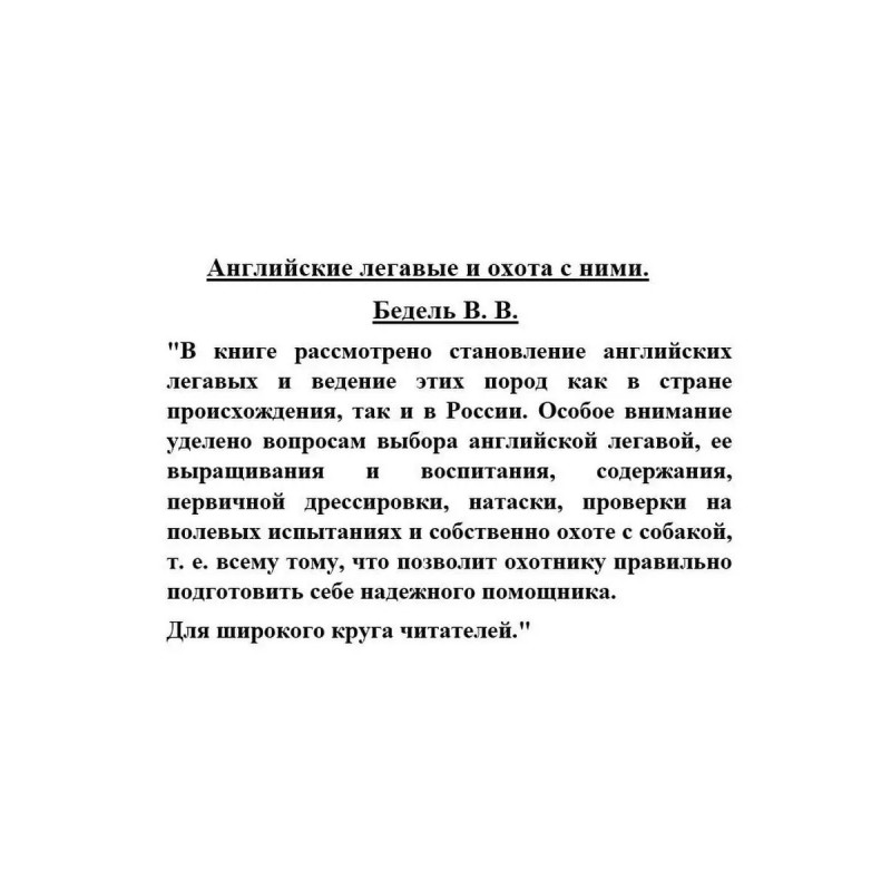 ISBN 9785-4484-35249. Английские легавые и охота с ними. Бедель В. В. Английские легавые и охота с ними. Бедель В. В. "В книге рассмотрено становление английских легавых и ведение этих пород как в стране происхождения, так и в России. Особое внимание уделено вопросам выбора английской легавой, ее выращивания и воспитания, содержания, первичной дрессировки, натаски, проверки на полевых испытаниях и собственно охоте с собакой, т. е. всему тому, что позволит охотнику правильно подготовить себе надежного помощника. Для широкого круга читателей.