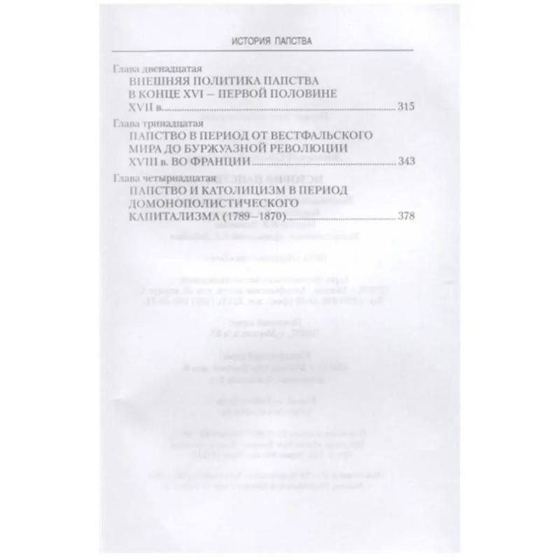 ISBN 9785-4484-39063. История папства. Лозинский С. Г. Эта знаменитая книга, написанная видным советским историком церкви, с момента своего выхода в 1934 г. выдержала несколько изданий и до сих пор заслуженно остается востребованной. История христианства немыслима без истории католической церкви, а она, в свою очередь, немыслима без понимания истории римского папского престола. Бесстрастно, век за веком, от становления церкви до XIX столетия прослеживает автор путь, пройденный Западной церковью на протяжении эпох. Увлекательное чтение разворачивает, по сути, картину истории всей Европы.