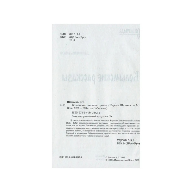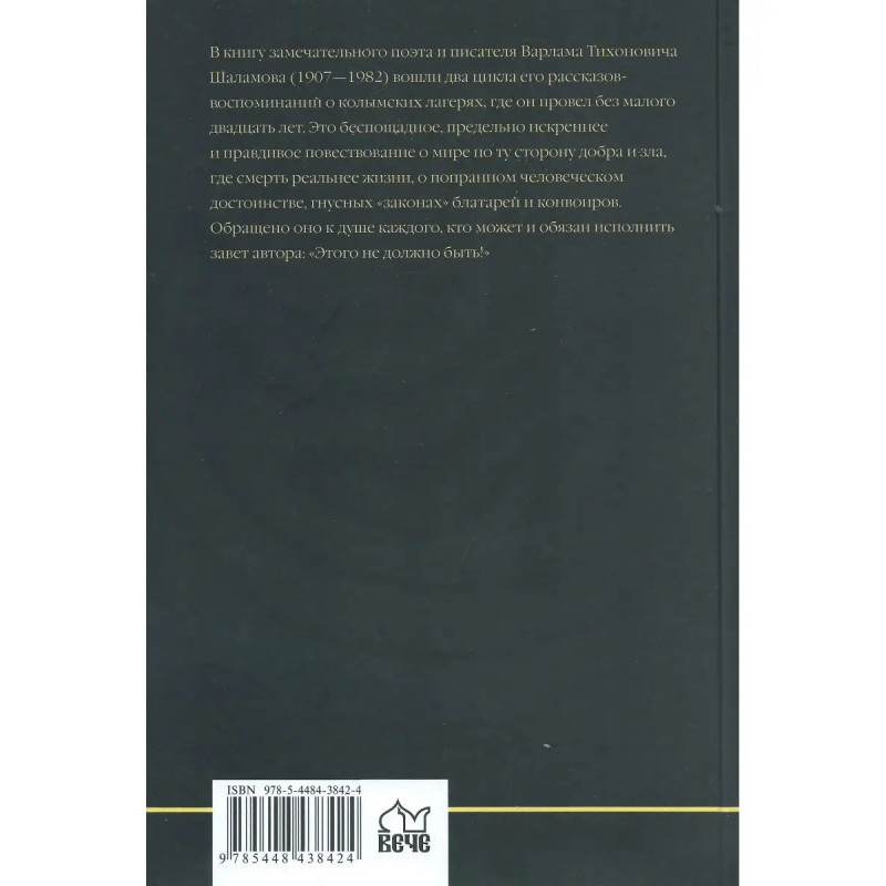 Колымские рассказы. В книгу замечательного поэта и писателя Варлама Тихоновича Шаламова (1907-1982) вошли два цикла его рассказов-воспоминаний о колымских лагерях, где он провел без малого двадцать лет. Это беспощадное, предельно искреннее и правдивое повествование о мире по ту сторону добра и зла, где смерть реальнее жизни, о попранном человеческом достоинстве, гнусных "законах" блатарей и конвоиров.