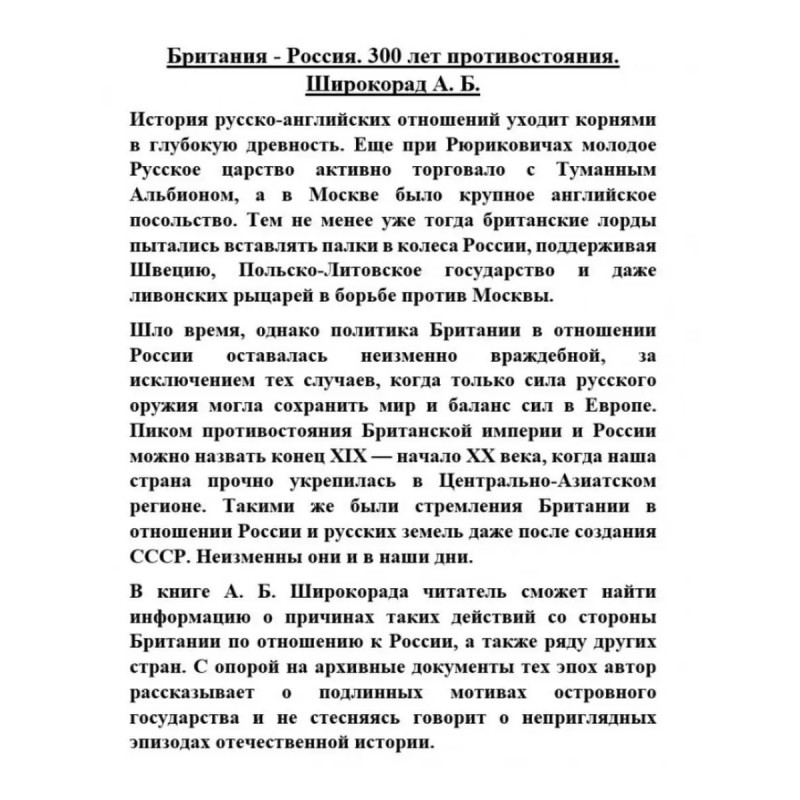 Британия - Россия. 300 лет противостояния. Британия - Россия. 300 лет противостояния. Широкорад А. Б. История русско-английских отношений уходит корнями в глубокую древность. Еще при Рюриковичах молодое Русское царство активно торговало с Туманным Альбионом, а в Москве было крупное английское посольство. Тем не менее уже тогда британские лорды пытались вставлять палки в колеса России, поддерживая Швецию, Польско-Литовское государство и даже ливонских рыцарей в борьбе против Москвы. Шло время, однако политика Британии в отношении России оставалась неизменно враждебной, за исключением тех случаев, когда только сила русского оружия могла сохранить мир и баланс сил в Европе. Пиком противостояния Британской империи и России можно назвать конец XIX начало XX века, когда наша страна прочно укрепилась в Центрально-Азиатском регионе. Такими же были стремления Британии в отношении России и русских земель даже после создания СССР. Неизменны они и в наши дни. В книге А. Б. Широкорада читатель сможет найти информацию о причинах таких действий со стороны Британии по отношению к России, а также ряду других стран. С опорой на архивные документы тех эпох автор рассказывает о подлинных мотивах островного государства и не стесняясь говорит о неприглядных эпизодах отечественной истории.