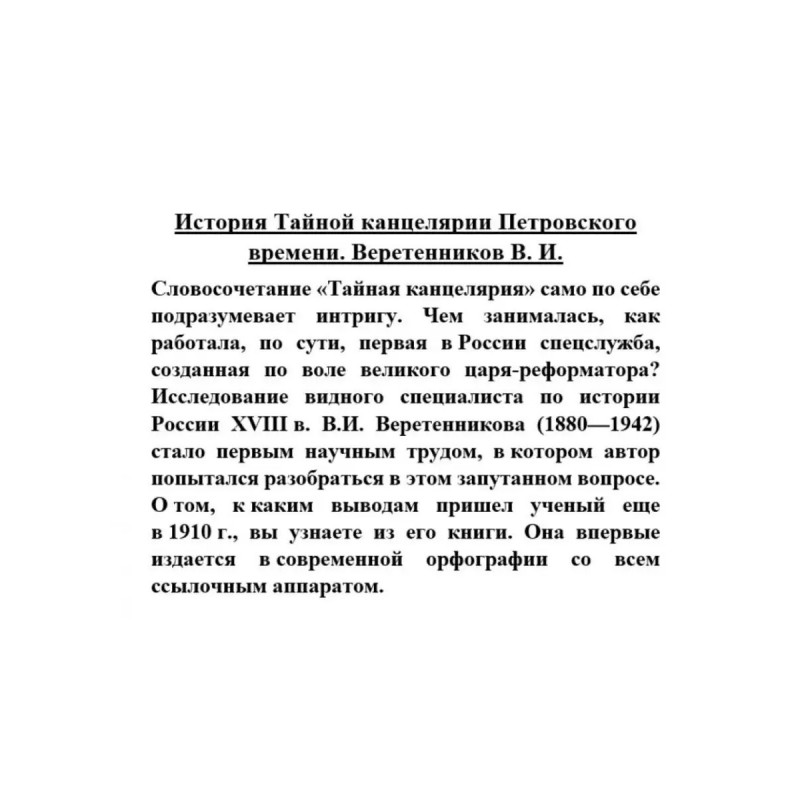 ISBN 9785-44844-0298. История Тайной канцелярии Петровского времени. Веретенников В. И. История Тайной канцелярии Петровского времени. Веретенников В. И. Словосочетание "Тайная канцелярия" само по себе подразумевает интригу. Чем занималась, как работала, по сути, первая вРоссии спецслужба, созданная по воле великого царя-реформатора? Исследование видного специалиста по истории России XVIIIв. В. И. Веретенникова (18801942) стало первым научным трудом, вкотором автор попытался разобраться вэтом запутанном вопросе. Отом, ккаким выводам пришел ученый еще в1910г., вы узнаете из его книги. Она впервые издается всовременной орфографии со всем ссылочным аппаратом.