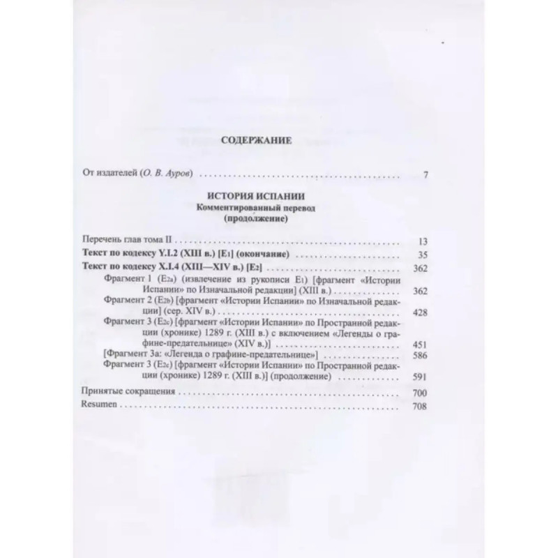 Альфонсо X Мудрый и сотрудники. История Испании. Том 2. История Испании выдающийся памятник средневекового историописания, одна из первых западноевропейских хроник, написанных на разговорном (средневековом кастильском) языке. История Испании была составлена под руководством короля Кастилии и Леона Альфонсо Х Мудрого (1252 1284) и охватывает период от заселения Испании легендарным Геркулесом до смерти короля Фернандо III Святого (1217 1252), отца Мудрого Короля. Во второй том вошли главы 308 801, повествующие о событиях IV начала XI в., от распространения христианства во времена Константина Великого (306 337) до конца правления короля Леона Бермудо III (1028 1037). Книга адресована ученым-медиевистам, специалистам по истории и культуре Испании, студентам и всем интересующимся историей западноевропейского Средневековья.