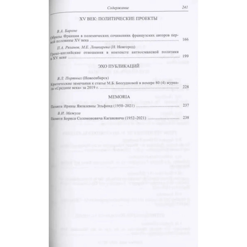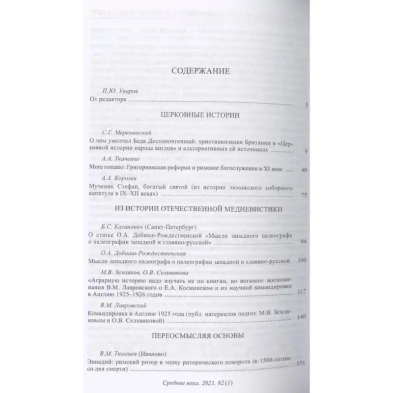 Средние века. Выпуск 82 (1). Выпуск содержит подборку материалов по церковной истории: истории христианизации, культа святых и богослужения. Большое место занимают публикации архивного наследия известных отечественных медиевистов не публиковавшейся ранее статьи О. А. Добиаш-Рождественской и воспоминаний В. М. Лавровского о Е. А. Косминском и об их совместной командировке в Англию 1925-1926 гг. Проблемам политического воображаемого, полемических форм и дипломатических контактов посвящен раздел XV век: политические проекты. Для историков и широкого круга читателей-гуманитариев.