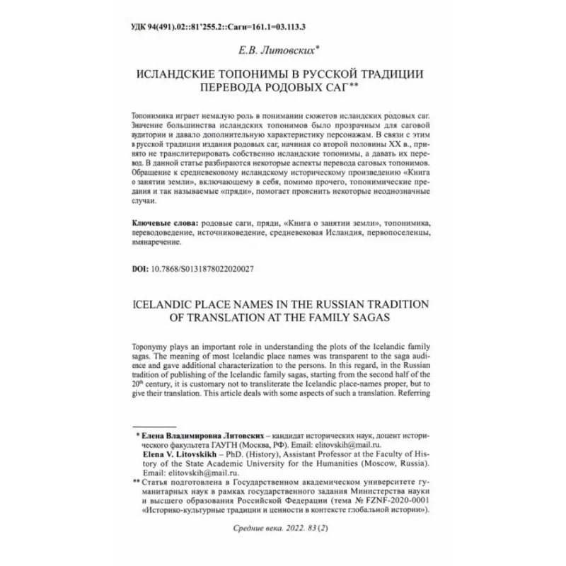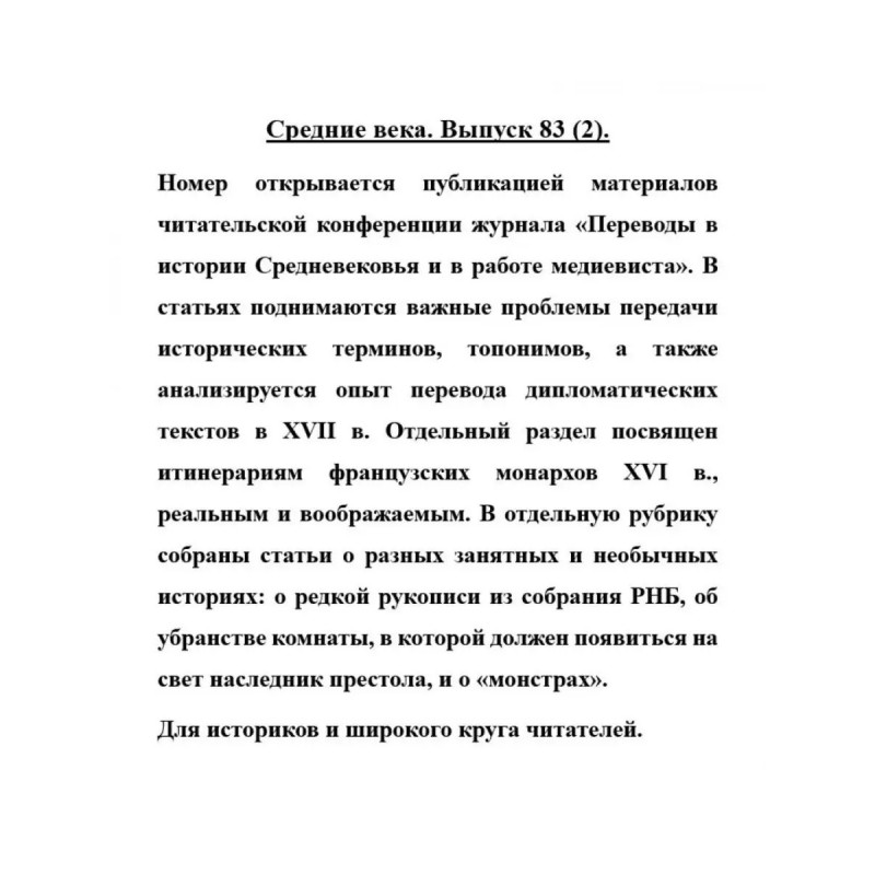 Средние века. Выпуск 83 (2). Номер открывается публикацией материалов читательской конференции журнала "Переводы в истории Средневековья и в работе медиевиста". В статьях поднимаются важные проблемы передачи исторических терминов, топонимов, а также анализируется опыт перевода дипломатических текстов в XVII в. Отдельный раздел посвящен итинерариям французских монархов XVI в., реальным и воображаемым. В отдельную рубрику собраны статьи о разных занятных и необычных историях: о редкой рукописи из собрания РНБ, об убранстве комнаты, в которой должен появиться на свет наследник престола, и о "монстрах". Для историков и широкого круга читателей.