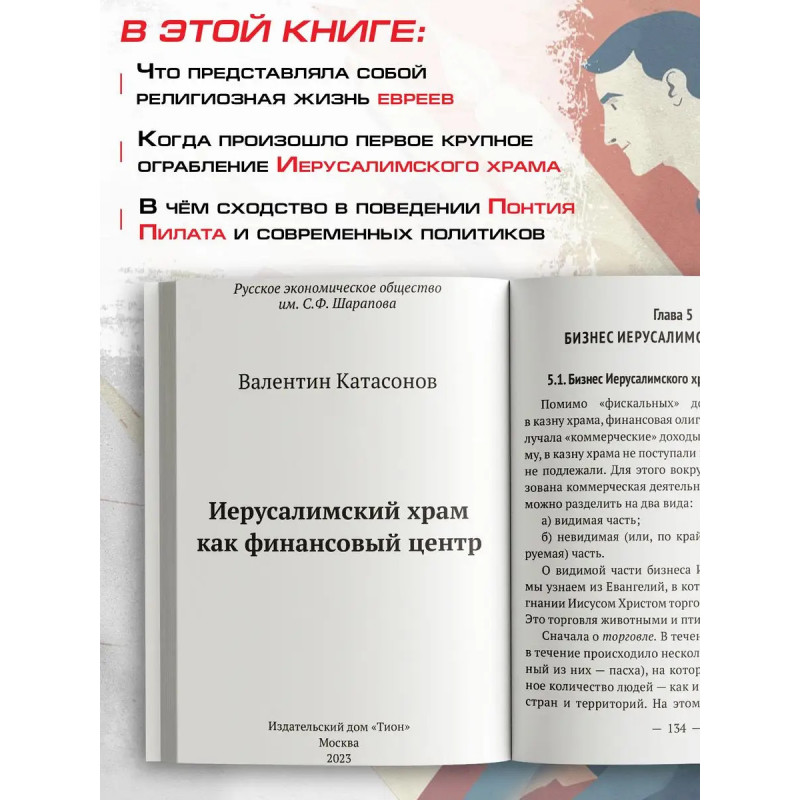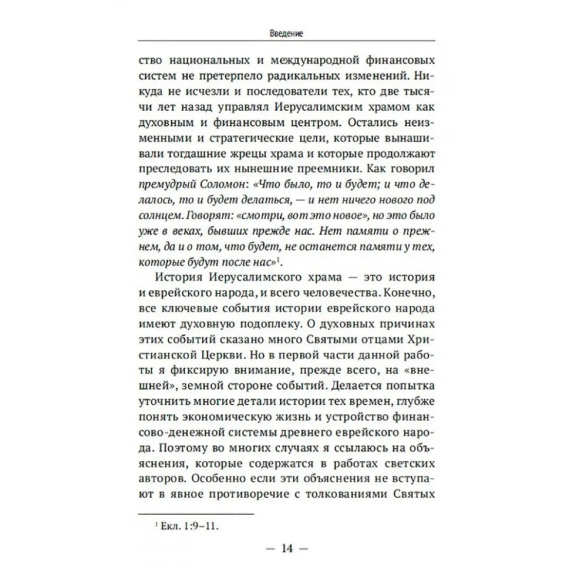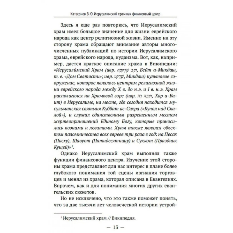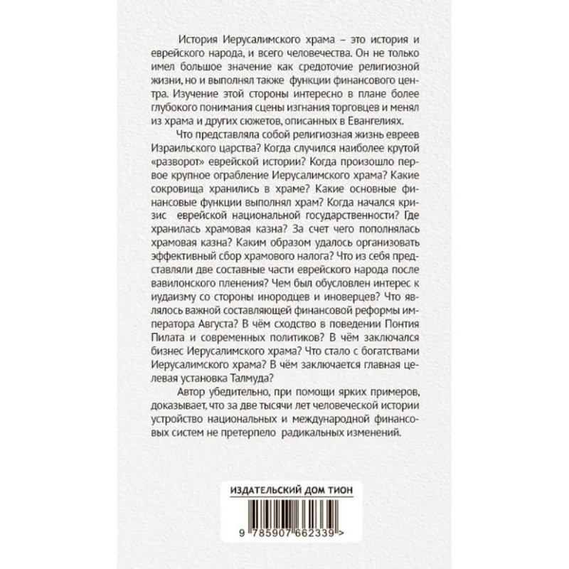 Иерусалимский храм. Катасонов В.Ю. История Иерусалимского храма это история и еврейского народа, и всего человечества. Он не только имел большое значение как средоточие религиозной жизни, но и выполнял также функции финансового центра. Изучение этой стороны интересно в плане более глубокого понимания сцены изгнания торговцев и менял из храма и других сюжетов, описанных в Евангелиях.Что представляла собой религиозная жизнь евреев Израильского царства? Когда случился наиболее крутой "разворот" еврейской истории? Когда произошло первое крупное ограбление Иерусалимского храма? Какие сокровища хранились в храме? Какие основные финансовые функции выполнял храм? Когда начался кризис еврейской национальной государственности? Где хранилась храмовая казна? За счет чего пополнялась храмовая казна? Каким образом удалось организовать эффективный сбор храмового налога? Что из себя представляли две составные части еврейского народа после вавилонского пленения? Чем был обусловлен интерес к иудаизму со стороны инородцев и иноверцев? Что являлось важной составляющей финансовой реформы императора Августа? В чём сходство в поведении Понтия Пилата и современных политиков? В чём заключался бизнес Иерусалимского храма? Что стало с богатствами Иерусалимского храма? В чём заключается главная целевая установка Талмуда?Автор убедительно, при помощи ярких примеров, доказывает, что за две тысячи лет человеческой истории устройство национальных и международной финансовых систем не претерпело радикальных изменений.