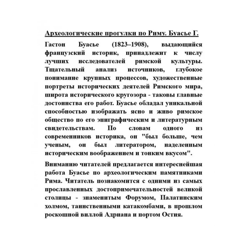 Археологические прогулки по Риму. Буасье Г. Гастон Буасье (1823-1908), выдающийся французский историк, принадлежит к числу лучших исследователей римской культуры. Тщательный анализ источников, глубокое понимание крупных процессов, художественные портреты исторических деятелей Римского мира, широта исторического кругозора - таковы главные достоинства его работ. Буасье обладал уникальной способностью изображать ясно и живо римское общество по его эпиграфическим и литературным свидетельствам. По словам одного из современников историка, он "был больше, чем ученым, он был литератором, наделенным историческим воображением и тонким вкусом". Вниманию читателей предлагается интереснейшая работа Буасье по археологическим памятниками Рима. Читатель познакомится с одними из самых прославленных достопримечательностей великой столицы - знаменитым Форумом, Палатинским холмом, таинственными катакомбами, в прошлом роскошной виллой Адриана и портом Остия.