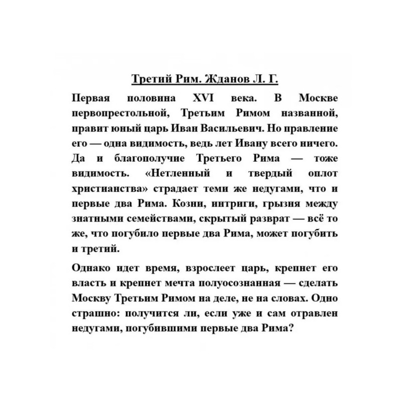 Третий Рим. Жданов Л. Г. Первая половина XVI века. В Москве первопрестольной, Третьим Римом названной, правит юный царь Иван Васильевич. Но правление его одна видимость, ведь лет Ивану всего ничего. Да и благополучие Третьего Рима тоже видимость. "Нетленный и твердый оплот христианства" страдает теми же недугами, что и первые два Рима. Козни, интриги, грызня между знатными семействами, скрытый разврат всё то же, что погубило первые два Рима, может погубить и третий. Однако идет время, взрослеет царь, крепнет его власть и крепнет мечта полуосознанная сделать Москву Третьим Римом на деле, не на словах. Одно страшно: получится ли, если уже и сам отравлен недугами, погубившими первые два Рима?