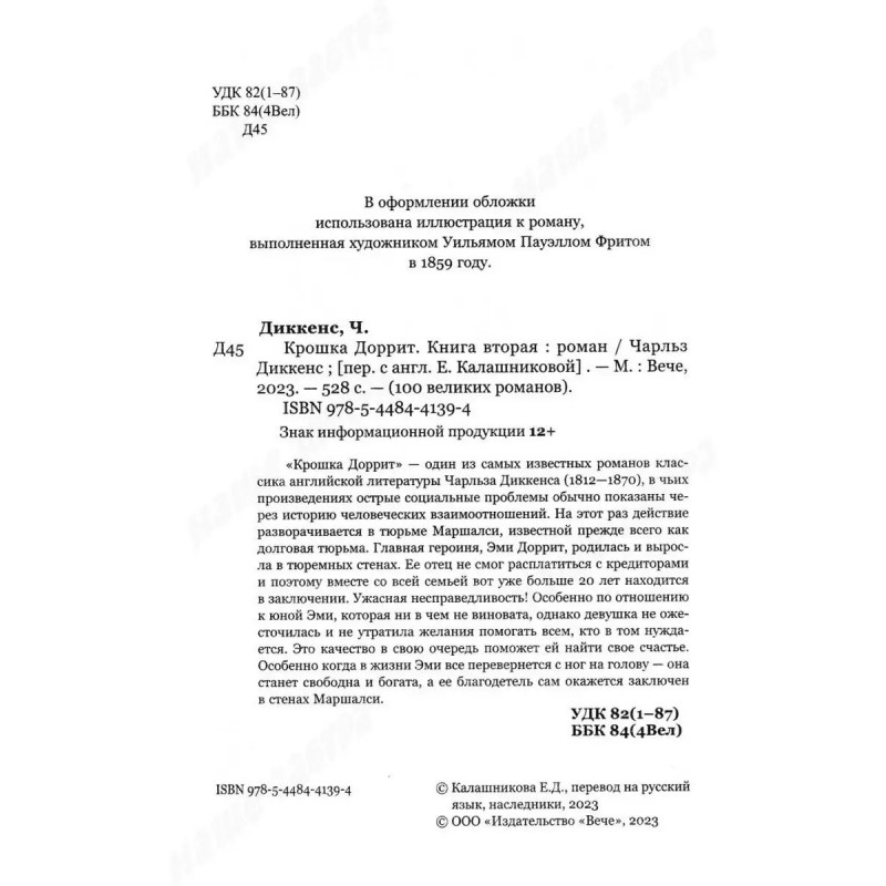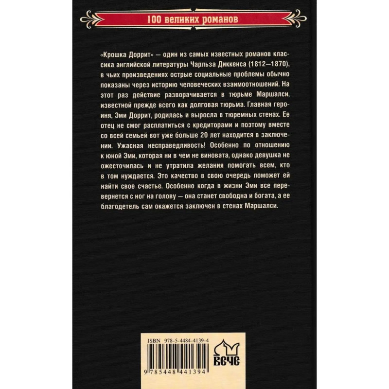 Крошка Доррит Книга 2. Диккенс Ч. Крошка Доррит один из самых известных романов классика английской литературы Чарльза Диккенса (18121870), в чьих произведениях острые социальные проблемы обычно показаны через историю человеческих взаимоотношений. На этот раз действие разворачивается в тюрьме Маршалси, известной прежде всего как долговая тюрьма. Главная героиня, Эми Доррит, родилась и выросла в тюремных стенах. Ее отец не смог расплатиться с кредиторами и поэтому вместе со всей семьей вот уже больше 20 лет находится в заключении. Ужасная несправедливость! Особенно по отношению к юной Эми, которая ни в чем не виновата, однако девушка не ожесточилась и не утратила желания помогать всем, кто в том нуждается. Это качество в свою очередь поможет ей найти свое счастье. Особенно когда в жизни Эми все перевернется с ног на голову она станет свободна и богата, а ее благодетель сам окажется заключен в стенах Маршалси.