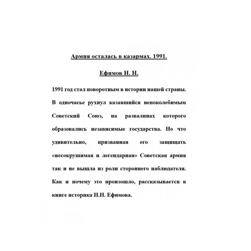 Армия осталась в казармах. 1991. Ефимов Н. Н. 1991 год стал поворотным в истории нашей страны. В одночасье рухнул казавшийся непоколебимым Советский Союз, на развалинах которого образовались независимые государства. Но что удивительно, призванная его защищать "несокрушимая и легендарная" Советская армия так и не вышла из роли стороннего наблюдателя. Как и почему это произошло, рассказывается в книге историка Н. Н. Ефимова.