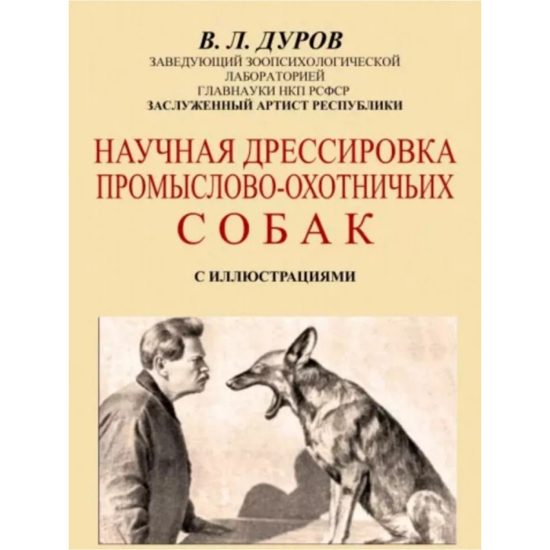Научная дрессировка промысловых охотничьих собак. Дуров В.Л. Владимир Леонидович Дуров (1863-1934) - российский и советский артист цирка, дрессировщик, заслуженный артист Республики. Родился Дуров в Москве в семье дворянина, полицейского пристава Тверского участка. Учился в военной гимназии, но оставил её, увлёкшись цирком. На арене с 1879 года. Начинал артистическую карьеру как силач, звукоподражатель, иллюзионист, художник-моменталист, куплетист и клоун. В зверинце Дуров начал выступать как дрессировщик с собакой, козлом, крысами и морскими свинками. Дрессировку животных построил на вырабатывании условных рефлексов путём поощрения: животное получало еду за сделанный трюк. В своём доме в Москве он проводил психологические опыты на животных, в частности, по телепатии, психологии, парапсихологии и т. д. Для работы привлекал В. М. Бехтерева и И. П. Павлова. Для зарабатывания денег в 1912 г. в своём доме, театр живого уголка, который позже стал называться "Уголок Дурова".Изданы так же репринты книг Дурова: Дрессировка животных: