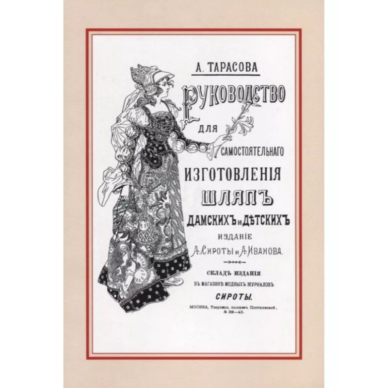 Руководство для самостоятельного изготовления шляп различных фасонов дамских и детских. Тарасова А. Н. Репринт с издания. Москва 1899. . С 44 рисунками в тексте. Тарасова - преподаватель "Школы шляп" при Обществе распространения практических знаний между образованными женщинами.