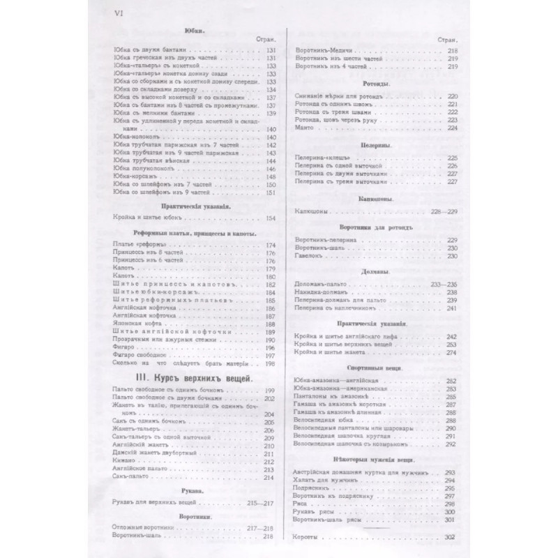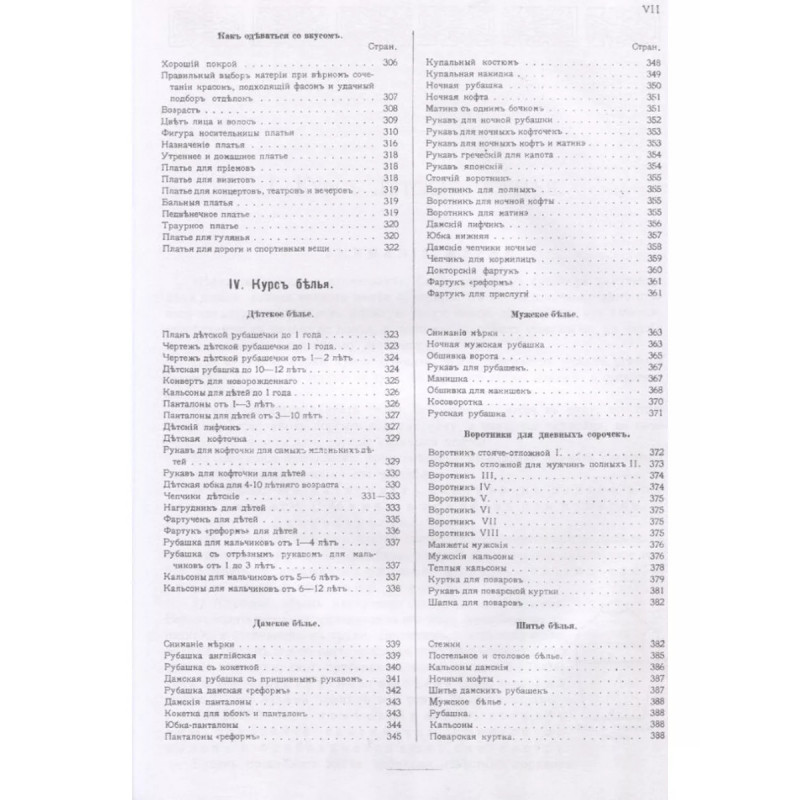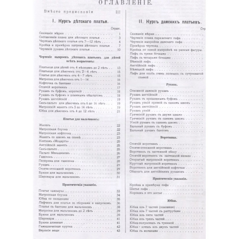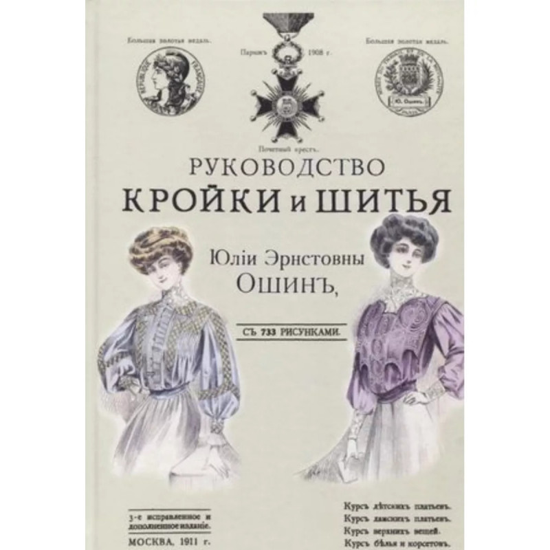 Руководство кройки и шитья для заочного обучения и как настольная книга для каждой семьи. Ошин Ю.Э. Репринт с издания. Москва. 1911. 733 рис. Содержание: 1. Курс детского платья: Черчение выкроек детских платьев для детей всех возрастов; Матроска для девочек, кофточка с бантами, сак-пальто и т.д.; Платья для мальчиков; Жилет, матросская блузка, костюм "Моцарт", пальто Меньшиков, гавелок и т.д.; Практические указания; Платье "ампир", гимназическая куртка и т.д.; 2. Курс дамских платьев: Венский лиф, английский лиф, немецкий лиф и т.д.; Рукава; Рукав английский, греческий рукав с двумя швами, бальный рукав с буфом и т.д.; Воротники; Практические указания; Шитье лифа, корсаж и его шитье и т.д.; Юбки; Юбка из семи частей, юбка-клеш из двух частей, юбка-"тальер" с кокеткой, юбка трубчатая венская и т.д.; Реформные платья, принцессы и капоты; Платье "реформ", капот, английская кофточка, японская кофточка, фигаро и т.д.; 3. Курс верхних вещей: Жакет-тальер, английский жакет, кимоно, английское пальто и т.д.; Рукава. Воротники. Воротник-Медичи. Ротонды. Пелерины. Капюшоны. Воротники для ротонд.