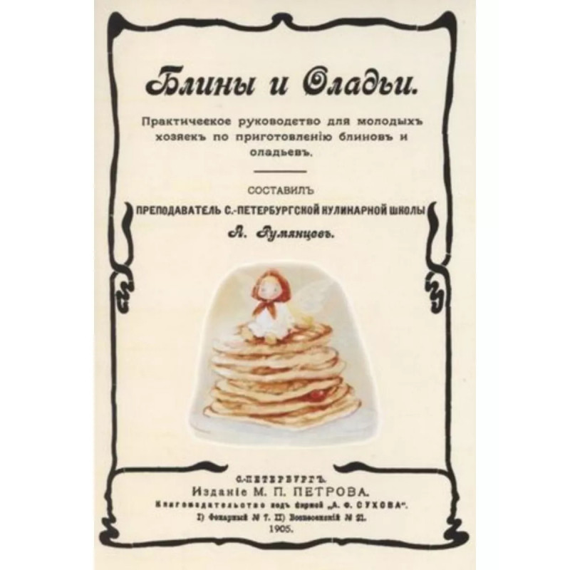 Блины и оладьи. Практическое руководство для молодых хозяек по приготовлению блинов и оладьев. Румянцев А. Репринт с издания. С.-Петербург, книгоиздательство "А.Ф. Сухова", 1905. Составил преподаватель С.-Петербургской кулинарной школы А. Румянцев. Сборник редких старинных рецептов.
