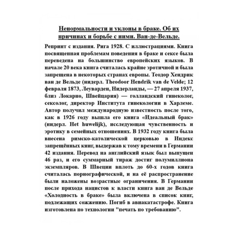 Ненормальности и уклоны в браке. Об их причинах и борьбе с ними. Ван-де-Вельде. Репринт с издания. Рига 1928. С иллюстрациями. Книга посвященная проблемам поведения в браке и сексе была переведена на большинство европейских языков. В начале 20 века книга считалась крайне эротичной и была запрещена в некоторых странах европы. Теодор Хендрик ван де Вельде (нидерл. Theodoor Hendrik van de Velde; 12 февраля 1873, Леуварден, Нидерланды, 27 апреля 1937, близ Локарно, Швейцария) голландский гинеколог, сексолог, директор Института гинекологии в Харлеме. Автор получил международную известность после того, как в 1926 году вышла его книга Идеальный брак (нидерл. Het huwelijk), исследующая чувственность и эротику в семейных отношениях. В 1932 году книга была внесена римско-католической церковью в Индекс запрещённых книг, выдержав к тому времени в Германии 42 издания. Перевод на английский язык был выпущен 46 раз, и его суммарный тираж достиг полумиллиона экземпляров. В Швеции вплоть до 60-х годов книга считалась порнографической, и на её распространение были наложены возрастные ограничения. В Германии после прихода нацистов к власти книга ван де Вельде Холодность в браке была включена в список книг, подлежащих сожжению. Погиб в авиакатастрофе. Книга изготовлена по технологии "печать по требованию".