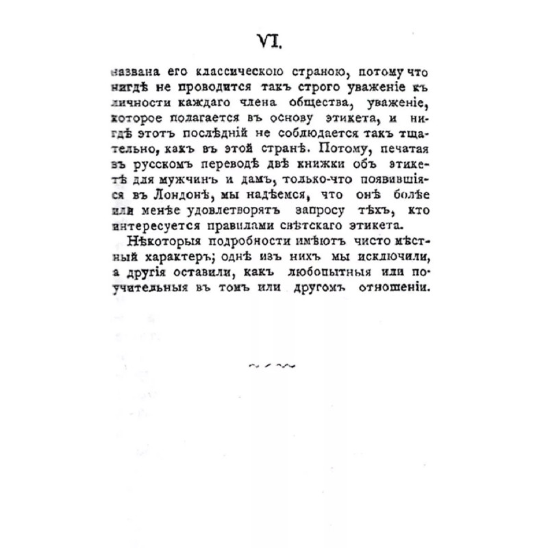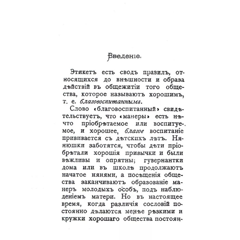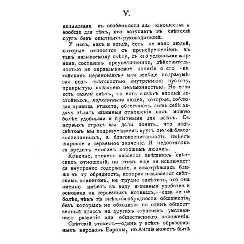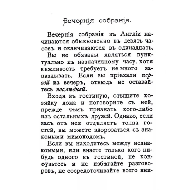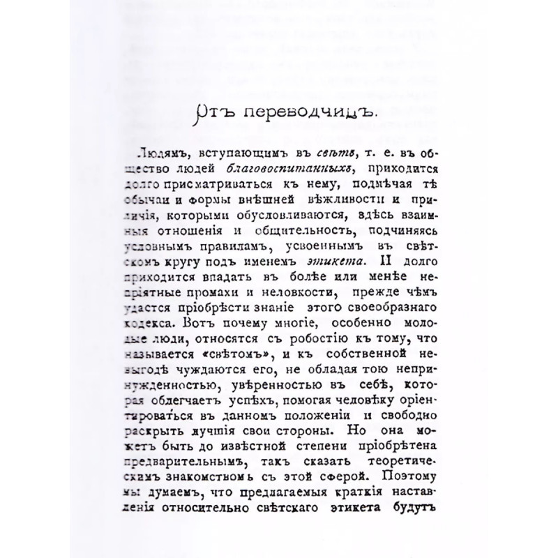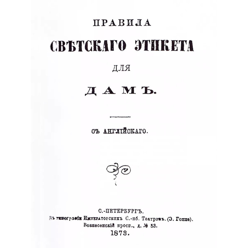 Правила светского этикета для дам.Репринт с издания. СПб., 1873. Перевод с английского. Содержание: От переводчика; Введение; Одежда; Утренние визиты; Представления и рекомендательные письма; Пригласительные записки; Утренние приглашения; Вечерние собрания; Обеды; Разговор и пр.; Этикет прогулок, езды и пр.; Бал; Разные замечания.Тираж 30 экз. выполнен по технологии print-on-demand.