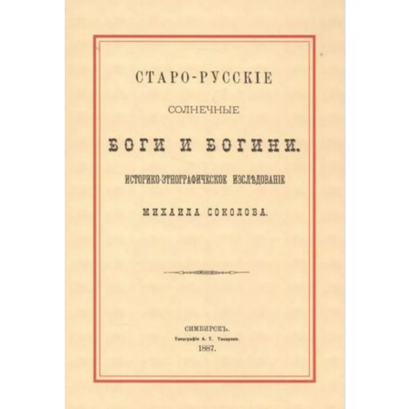 Старорусские солнечные боги и богини. Соколов М.Е. Историко - этнографическое исследование Михаила Соколова. Репринт с издания 1887 г. .Соколов Михаил Евгеньевич (родился в 1860 г.) - писатель воспитанник Казанской духовной академии. Его труды "Старорусские солнечные боги и богини" (Симбирск, 1887), "Краткая история философии" (ib., 1889), "Введение в философию" (Петровск, 1894) "Былины исторические военные, разбойничьи и воровские песни записанные в Саратовской губернии" (Петровск, 1896), "Великорусские свадебные песни и причитания, записанные в Саратовской губернии" (Саратов 1898).