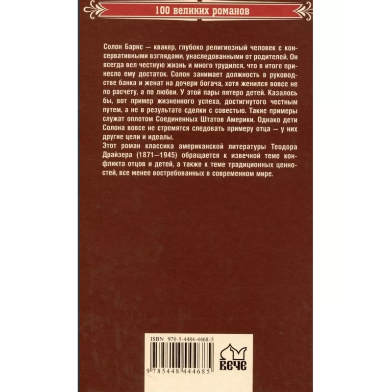Оплот. Драйзер Т. Солон Барнс квакер, глубоко религиозный человек с консервативными взглядами, унаследованными от родителей. Он всегда вел честную жизнь и много трудился, что в итоге принесло ему достаток. Солон занимает должность в руководстве банка и женат на дочери богача, хотя женился вовсе не по расчету, а по любви. У этой пары пятеро детей. Казалось бы, вот пример жизненного успеха, достигнутого честным путем, а не в результате сделки с совестью. Такие примеры служат Оплотом Соединенных Штатов Америки. Однако дети Солона вовсе не стремятся следовать примеру отца у них другие цели и идеалы. Этот роман классика американской литературы Теодора Драйзера (18711945) обращается к извечной теме конфликта отцов и детей, а также к теме традиционных ценностей, все менее востребованных в современном мире.