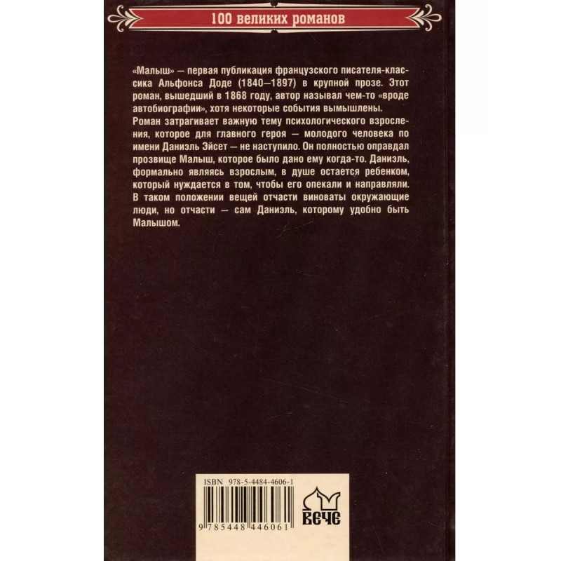 Малыш. Доде А. "Малыш" - первая публикация французского писателя-классика Альфонса Доде (1840-1897) в крупной прозе. Этот роман, вышедший в 1868 году, автор называл чем-то "вроде автобиографии", хотя некоторые события вымышлены. Роман затрагивает важную тему психологического взросления, которое для главного героя - молодого человека по имени Даниэль Эйсет - не наступило. Он полностью оправдал прозвище Малыш, которое было дано ему когда-то. Даниэль, формально являясь взрослым, в душе остается ребенком, который нуждается в том, чтобы его опекали и направляли. В таком положении вещей отчасти виноваты окружающие люди, но отчасти - сам Даниэль, которому удобно быть Малышом.