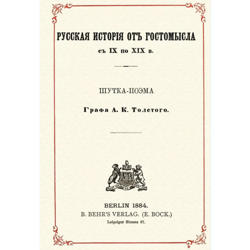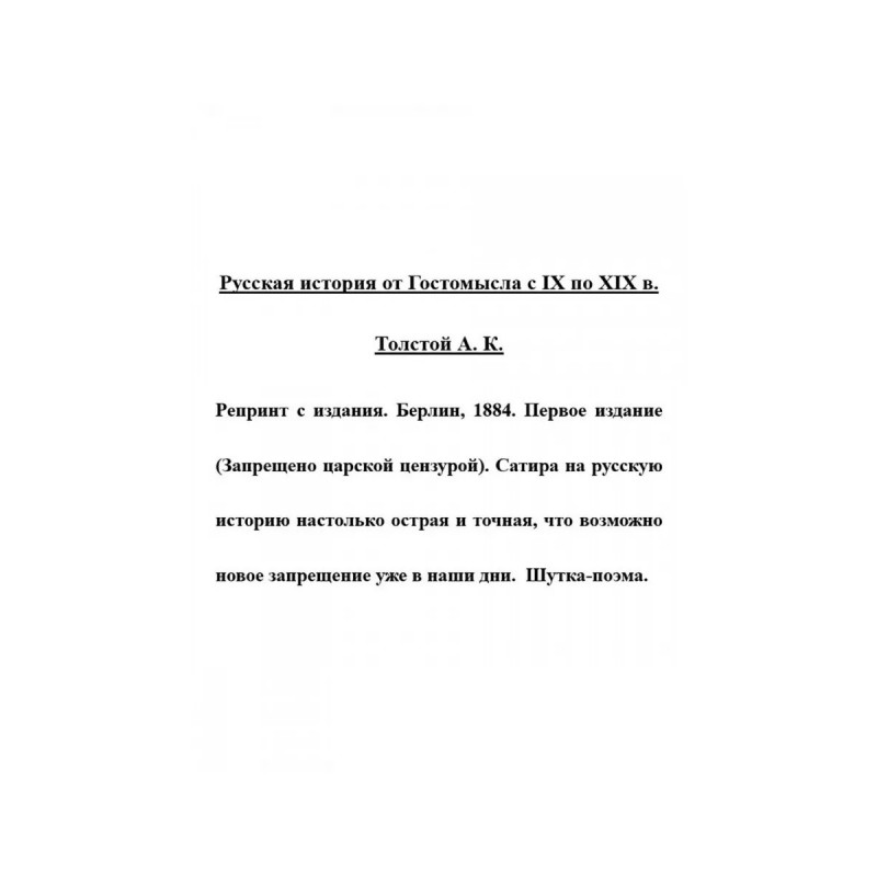 Русская история от Гостомысла с IX по XIX в. Толстой Л. Н. Репринт с издания. Берлин, 1884. Первое издание (Запрещено царской цензурой). Сатира на русскую историю настолько острая и точная, что возможно новое запрещение уже в наши дни. Шутка-поэма.