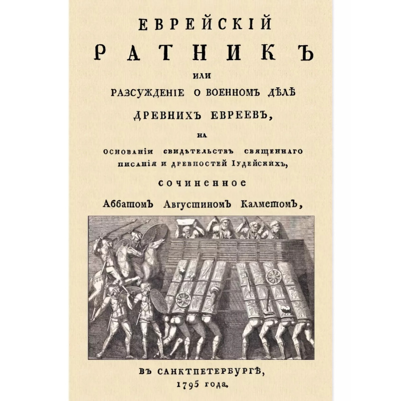Еврейский ратник или Разсуждение о военном деле древних евреев, на основании свидетельств священного писания и Древностей иудейских. Антуан Огюстен Кальме, O.S.B. (1672 - 1757), известный под религиозным именем Дом Кальме (Dom Calmet) - французский учёный аббат-бенедиктинец родом из Лотарингии. Кальмет был набожным монахом, а также образованным человеком и одним из самых выдающихся членов Церкви. Ему дважды доверяли должность Аббат генерал собрания. Папа Бенедикт XIII хотел дать ему епископский сан, но он отказался сославшись на монашеское смирение.