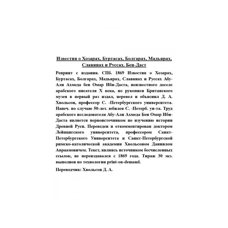 Известия о Хозарах, Буртасах, Болгарах, Мадьярах, Славянах и Руссах. Бен-Даст.Репринт с издания. СПб. 1869 Известия о Хозарах, Буртасах, Болгарах, Мадьярах, Славянах и Руссах Абу-Али Ахмеда бен Омар Ибн-Даста, неизвестного доселе арабского писателя X века, по рукописи Британского музея в первый раз издал, перевел и объяснил Д. А. Хвольсон, профессор С. -Петербургского университета. Напеч. по случаю 50-лет. юбилея С. -Петерб. ун-та. Труд арабского исследователя Абу-Али Ахмеда Бен Омар Ибн-Даста является первоисточником по изучению истории Древней Руси. Переведен и откомментирован доктором Лейпцигского университета, профессором Санкт-Петербургского Университета и Санкт-Петербургской римско-католической академии Хвольсоном Даниилом Авраамовичем. Текст, являясь источником бесчисленных ссылок, не переиздавался с 1869 года. Тираж 30 экз. выполнен по технологии print-on-demand.Переводчик: Хвольсон Д. А.
