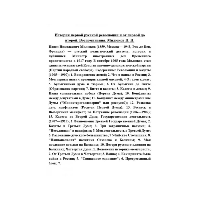 История первой русской революции и от первой до второй. Воспоминания. Милюков П.Н. Павел Николаевич Милюков (1859, Москва 1943, Экс-ле-Бен, Франция) русский политический деятель, историк и публицист. Министр иностранных дел Временного правительства в 1917 году. В октябре 1905 года Милюков стал одним из основателей Конституционно-демократической партии (Партии народной свободы). Содержание: Революция и кадеты (19051907); 1. Возвращение домой; 2. Что я нашел в России; 3. Мои первые шаги с примирительной миссией; 4 От слов к делу; 5. Булыгинская дума и тюрьма; 6 От Булыгина до Витте (Образование партии); 7. Витте и кадеты; 8. Кадеты и левые; 9. Наша сомнительная победа (Первая Дума); 10. Конфликты между депутатами в Думе; 11. Конфликт между министрами вне Думы ("Министерстводоверия" или роспуск?); 12. Развязка двух конфликтов (Роспуск Первой Думы); 13. Роспуск и Выборгский манифест; 14. Потухание революции (19061907); 15. Кадеты во Второй Думе; Государственная деятельность (19071917); 1 Физиономия Третьей Государственной Думы; 2. Кадеты в Третьей Думе; 3. Три заграничные поездки; 4. "Неославизм" и пацифизм; 5. Моя деятельность в Третьей Думе; 6. Разложение думского большинства; 7 Убийство Столыпина; 8. "Национальная" политика Сазонова и Балканы; 9. Мои последние поездки на Балканы; 10. Потеря русского влияния на Балканах; Четвертая Дума; 1. Положение историка-мемуариста; 2. От Третьей Думы к Четвертой; 3. Война; 4. Как принята была война в России?; 5. "Священное единение"; 6. Прогрессивный блок; 7.