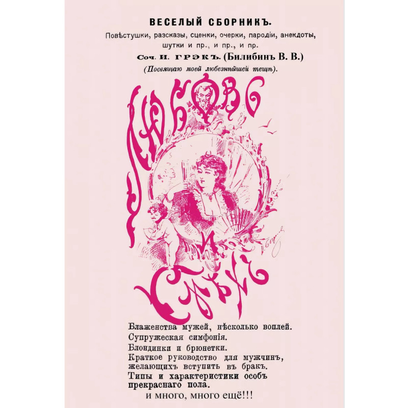 Любовь и смех (Веселый сборник). Билибин В. В. Репринт с издания. СПб. , 1882. Любовь и смех (Веселый сборник). Повестушки, рассказы, сценки, очерки, пародии, анекдоты, шутки и пр. и пр. и пр. (Посвящаю моей любезнейшей теще). Сочинил И. Грэк [псевд. ]. Содержание: Блаженства мужей, несколько воплей. Супружеская симфония; Блондинки и брюнетки; Краткое руководство для мужчин, желающих вступить в брак; Типы и характеристики особ прекрасного пола; и много, много ещё!!! Билибин, Виктор Викторович (18591908) русский прозаик, драматург, журналист и чиновник. Признанный мастер малых жанров журнальной прозы: его фельетоны, экспромты, каламбуры и пародии были особенно популярны в начале 1880 годов и высоко ценились Чеховым. С 1885 года был знаком с Чеховым, на протяжении пятнадцати лет между ними велась откровенная переписка. В 19061908 годах, после смерти Н. А. Лейкина, был редактором-издателем Осколков. В 18901900 годах возглавлял международный отдел в Главном управлении почт и телеграфов. Действительный статский советник. Тираж 30 экз. выполнен по технологии print-on-demand.