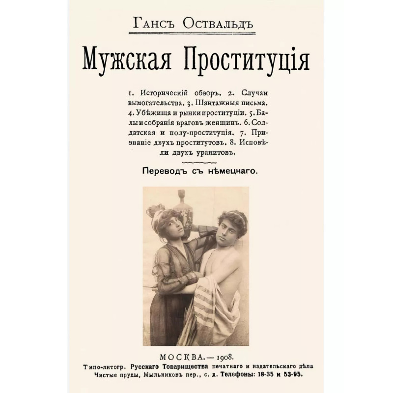 Мужская проституция. Оствальд Ганс. Репринт с издания. Москва, 1908. Перевод с немецкого. Содержание: 1. Исторический обзор. 2. Случаи вымогательства. 3. Шантажные письма. 4. Убежища и рынки проституции. 5. Балы и собрания врагов женщин. 6. Солдатская и полу-проституция. 7. Признание двух проститутов. 8. Исповеди двух уранитов. Тираж 30 экз. выполнен по технологии print-on-demand.