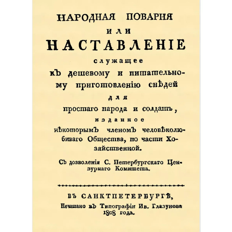 Народная поварня или наставление служащее к дешевому и питательному приготовлению снедей Репринт с издания. СПб., 1808. Полное название: Народная поварня, или Наставление служащее к дешевому и питательному приготовлению снедей для простого народа и солдат, изданное некоторым членом Человеколюбивого общества, по части хозяйственной. Содержание: Вступление (о приготовлении снедей вообще; о студне без костей); Супы; Вторые блюда; Мучные блюда; Блюда из овощей; Блюда из гороха и других бобовых; О постных блюдах; Запасы. Тираж 30 экз. выполнен по технологии print-on-demand.
