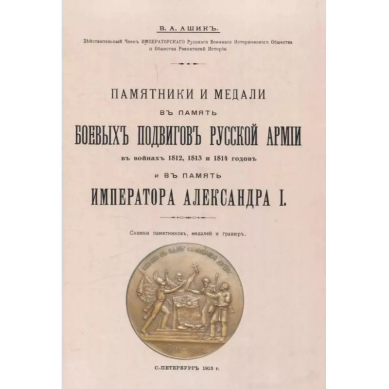 Памятники и медали в память боевых подвигов русской армии в войнах 1812, 1813 и 1814 годов и в память императора Александра I. Ашик В.А. Памятники и медали в память боевых подвигов русской армии в войнах 1812, 1813 и 1814 годов и в память императора Александра I Снимки памятников, медалей и гравюр / В.А. Ашик, действ. чл. Рус. воен.-ист. о-ва и О-ва ревнителей истории. Санкт-Петербург : тип. т-ва п/ф. "Электро-тип. Н.Я. Стойковой", 1913 г.Книга изготовлена по технологии print-on-demand(печать по требованию)Эксклюзивное издание. Тираж 30 экз.Книга напечатана на русском языке с дореволюционной (дореформенной) орфографией.