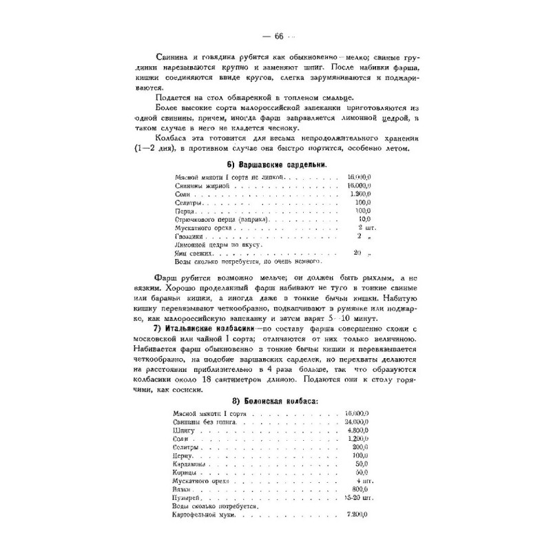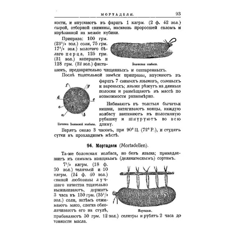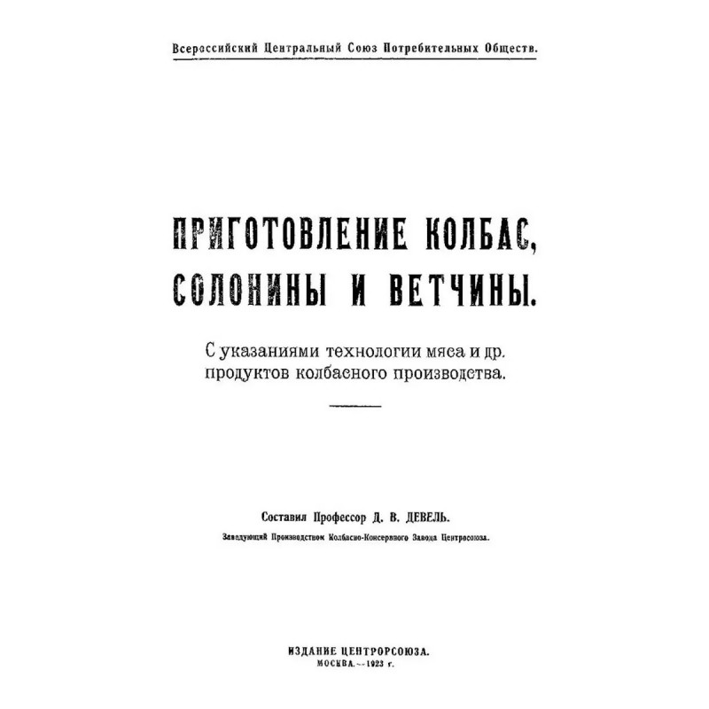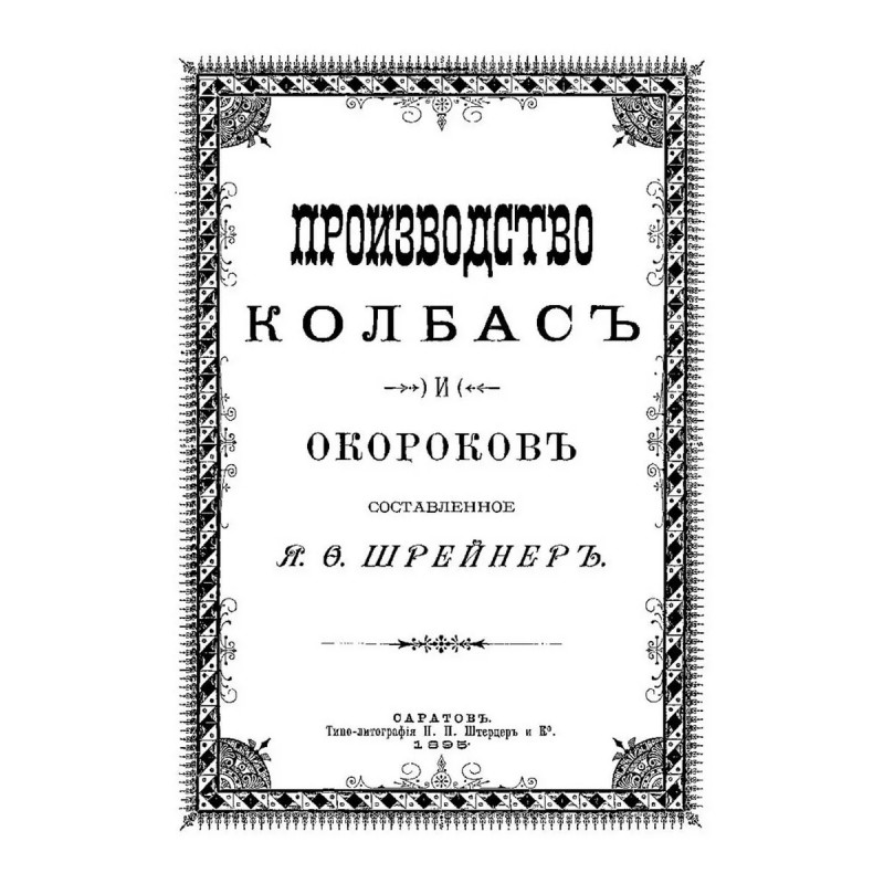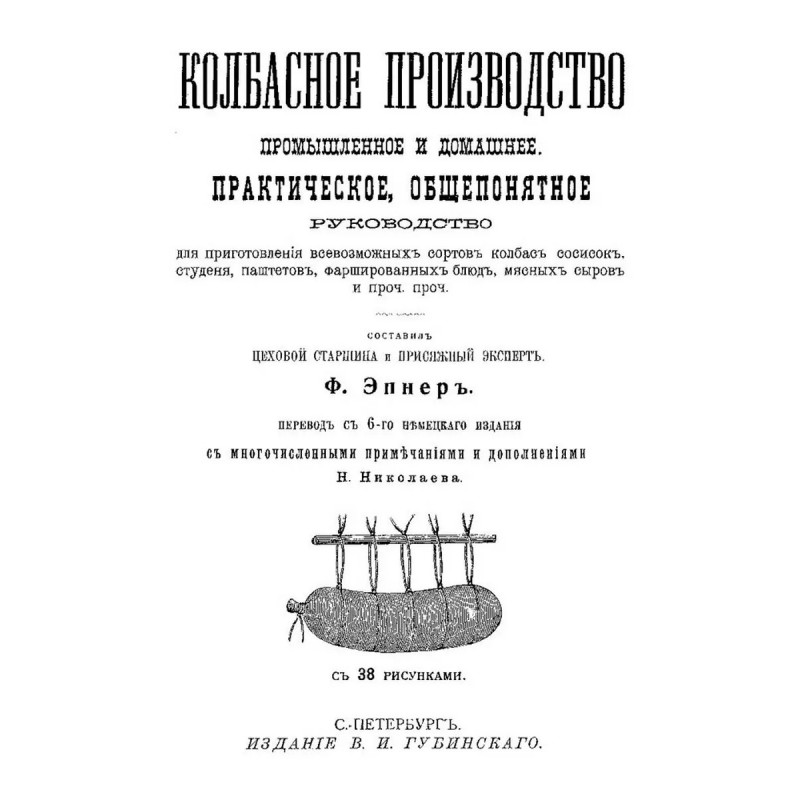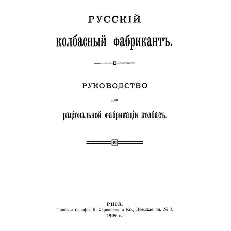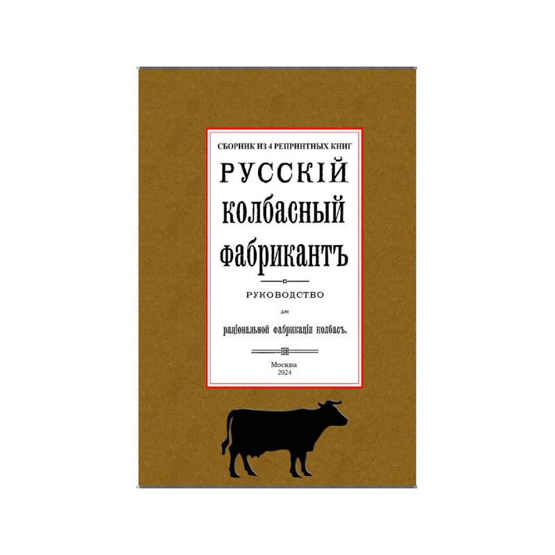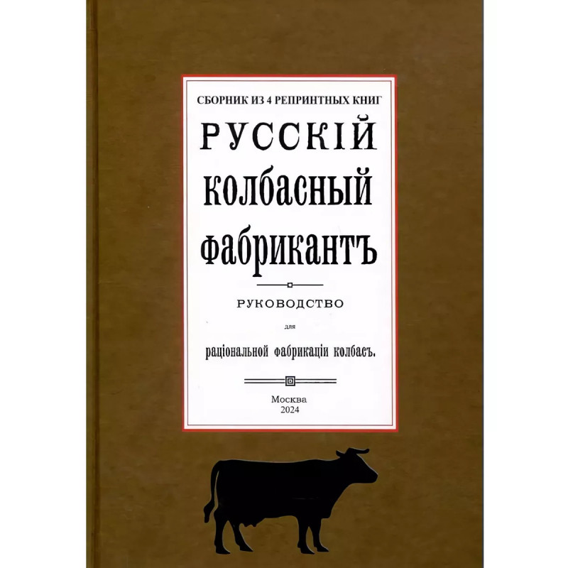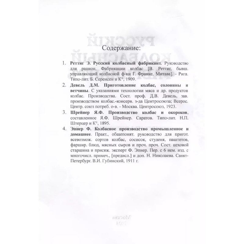 Русский колбасный фабрикант. (сборник 4 репринтных книг). Репринт с изданий. Содержание: 1. Реттиг Э. Русский колбасный фабрикант. Руководство для рацион. Фабрикации колбас [В. Реттиг, бывш. управляющий колбасной ф-ки Г. Франке, Митава]. - Рига. Типо-лит. Б. Серенсен и К, 1909. 2. Девель Д.М. Приготовление колбас, солонины и ветчины. С указаниями технологии мяса и др. продуктов колбас. Производства. Сост. проф. Д.В. Девель, зав. производством колбас.-консерв. з-да Центросоюза; Всерос. Центр. союз потреб. о-в. - Москва. Центросоюз, 1923. 3. Шрейнер Я.Ф. Производство колбас и окороков, составленное Я.Ф. Шрейнер. Саратов. Типо-лит. Н.П. Штерцер и К, 1895. 4. Мороховцев, К.К. Колбасное производство. Домашне-фабрич. пр-во разновид. сортов колбасы рус. и загран. разных вкусов. Необходимая кн. для сел. хозяев, промышленников кустарей, заводчиков домаш. обихода, управляющих, гастрономов и многих др. В 2 ч. Сост. по самым послед. новейшим рус. и иностр. источникам колбас. дел мастер специалист К.К. Мароховцев. Москва. Аренд. типо-лит. Яковлевой, А.П. Поплавский, 1898 г. 5. Эпнер Ф. Колбасное производство промышленное и домашнее. Практ., общепонят. руководство для пригот. всевозмож. сортов колбас, сосисок, студеня, паштетов, фаршир. блюд, мясных сыров и проч. проч. Сост. цеховой старшина и присяж. эксперт Ф. Эпнер. Пер. с 6 нем. изд. с многочисл. примеч., [предисл.] и доп. Н. Николаева. Санкт-Петербург. В.И. Губинский, 1911 г.Книга изготовлена по технологии "печать по требованию". Тираж 30 экз. Книга напечатана на русском языке с дореволюционной (дореформенной) орфографией
