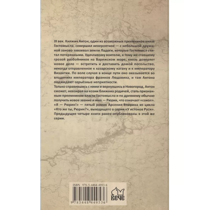 Я - Рюрик! Втюрин А. Е. IX век. Княжич Антон, один из возможных преемников князя Гостомысла, совершил невероятное с небольшой дружиной заново завоевал земли Ладоги, которые Гостомысл считал потерянными. Удачливому воителю, к тому же ставшему грозой разбойников на Варяжском море, князь доверяет новое дело встретить и доставить домой посольство, некогда отправленное к хазарскому кагану и к императору Византии. По воле случая в конце пути оно оказывается во владениях императора франков Людовика, и там Антона поджидают серьёзные неприятности. Только справившись с ними и вернувшись в Новогород, Антон сможет, невзирая на козни ближних родичей, стать признанным преемником власти Гостомысла и по древнему обычаю получить новое звание и имя Рюрик, что означает сокол. Я Рюрик! пятый роман Арсения Втюрина из цикла Кто же ты, Рюрик?, выходящего в серии У истоков Руси. Предыдущие четыре книги ранее опубликованы в этой же серии.