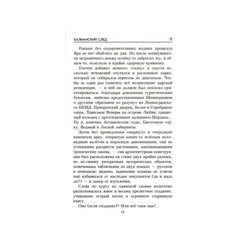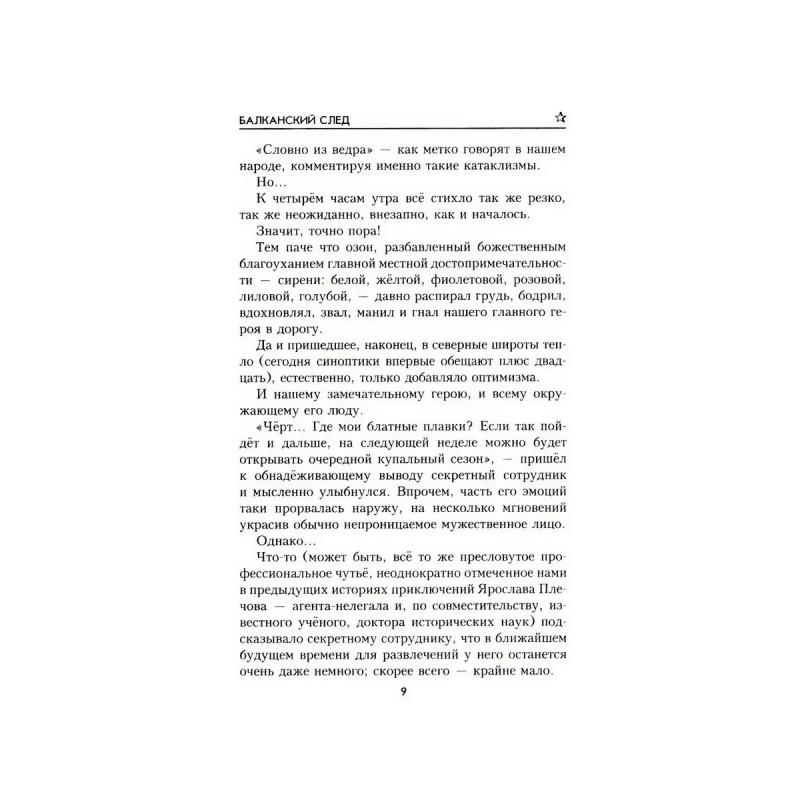 Новый роман известного современного писателя, лауреата литературной премии "Во славу Отечества" Сергея Бортникова "Балканский след" уже седьмое по счёту и, как полагает сам автор, заключительное произведение из цикла о приключениях Ярослава Плечова, дипломированного историка и одновременно сотрудника советских спецслужб, возглавляющего государственную комиссию по возвращению на Родину вывезенных за рубеж ценностей, произведений искусства и древних артефактов. Яра и его друзья, среди которых полюбившийся читателям академик Мыльников ("Необычное задание", "Загадочные свитки"), найдут наконец Ломоносовские свитки и продолжат поиски других реликвий, ранее принадлежавших Российской империи: Филермской иконы Божией Матери, частицы Древа Животворящего Креста, десницы Иоанна Крестителя, вывезенных в Европу из Гатчинского дворца вскоре после революции 1917 года. Следы ведут на Балканы!