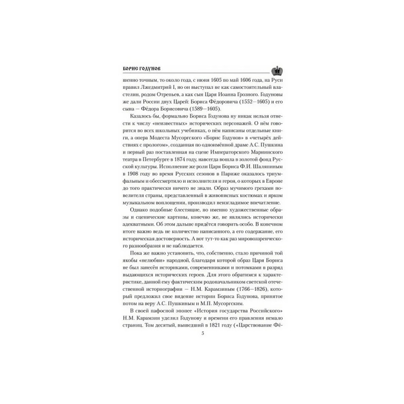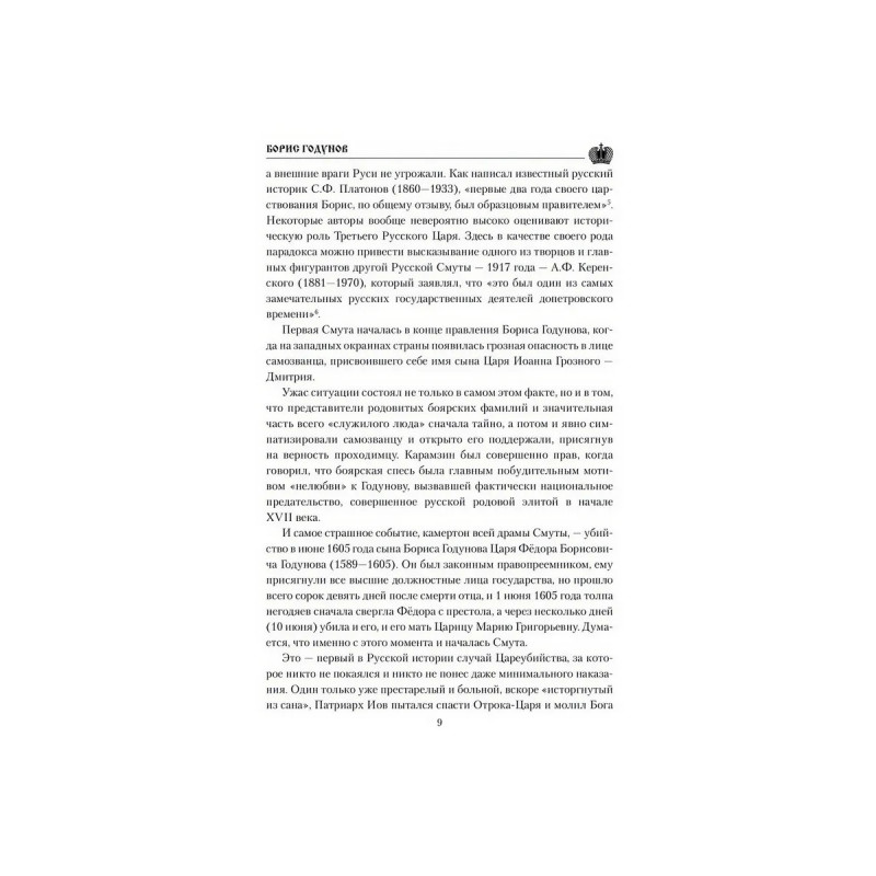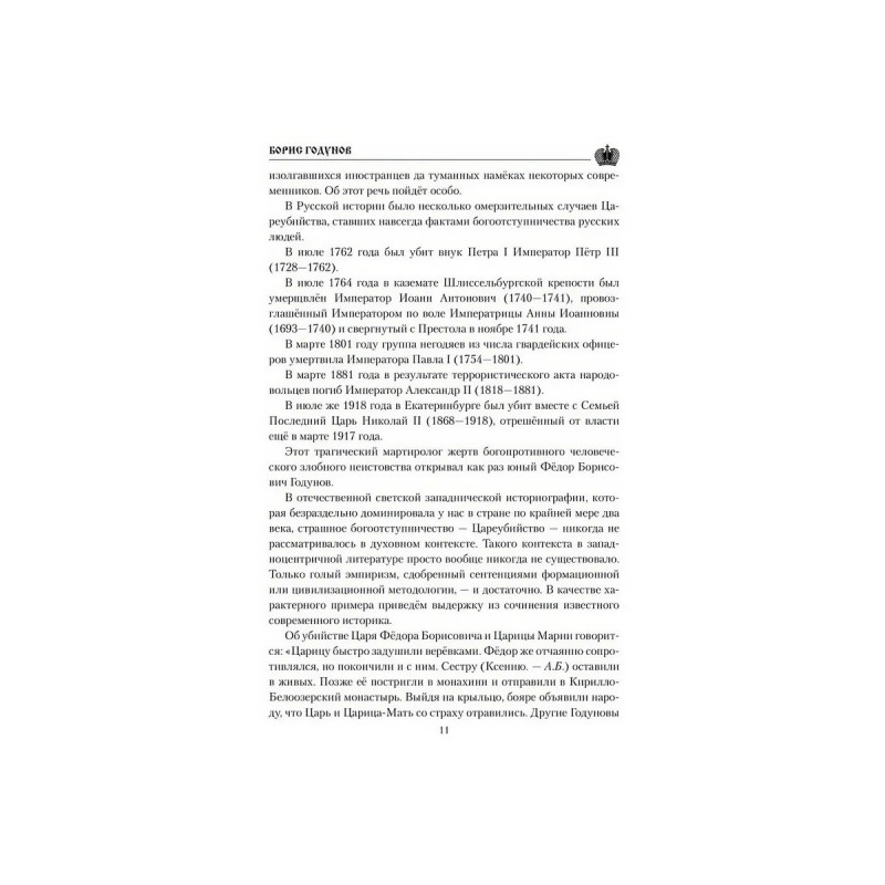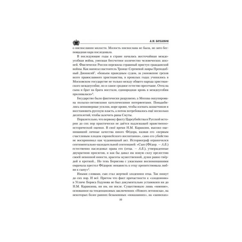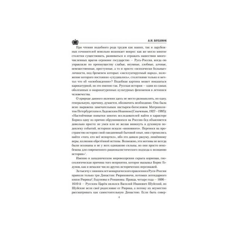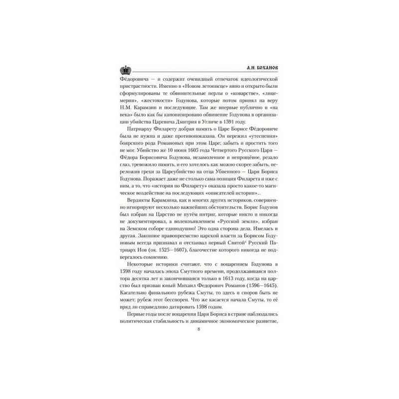 Фигура Бориса Годунова вызывает у многих историков явное неприятие. Он изображается "коварным", "лицемерным", "лукавым", а то и "преступным", ставшим в конечном итоге виновником Великой Смуты начала XVII века, когда Русское Государство фактически было разрушено. Но так ли это на самом деле? Виновен ли Борис в страшном преступлении убийстве царевича Димитрия? Пожалуй, вся жизнь Бориса Годунова ставит перед потомками самые насущные вопросы. Как править, чтобы заслужить любовь своих подданных, и должна ли верховная власть стремиться к этой самой любви наперекор стратегическим интересам государства? Что значат предательство и отступничество от интересов страны во имя текущих, клановых выгод и преференций? Где то мерило, которым можно измерить праведность властителей, и какие интересы должна выражать и отстаивать власть, чтобы заслужить признание потомков?На эти и другие вопросы отвечает книга известного российского историка А. Н. Боханова (19442019).