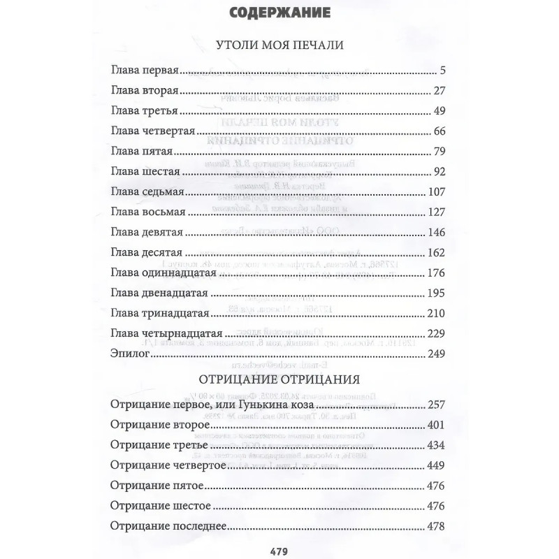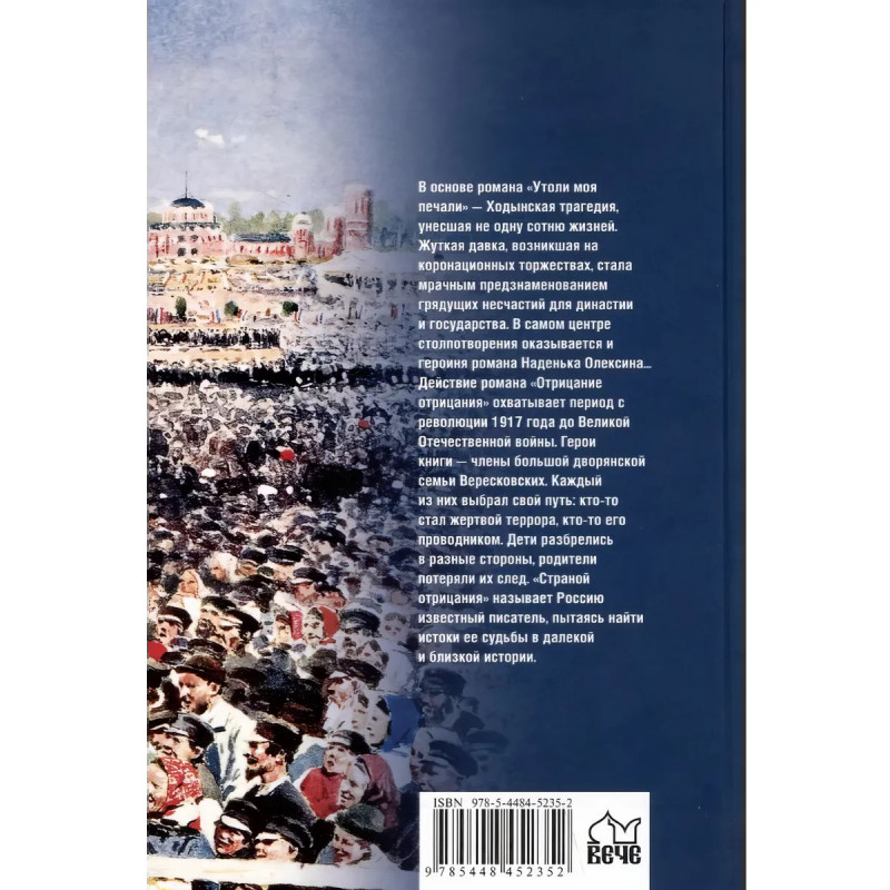 В основе романа Утоли моя печали Ходынская трагедия, унесшая не одну сотню жизней. Жуткая давка, возникшая на коронационных торжествах, стала мрачным предзнаменованием грядущих несчастий для династии и государства. В самом центре столпотворения оказывается и героиня романа Наденька Олексина... Действие романа Отрицание отрицания охватывает период с революции 1917 года до Великой Отечественной войны. Герои книги члены большой дворянской семьи Вересковских. Каждый из них выбрал свой путь: кто-то стал жертвой террора, кто-то его проводником. Дети разбрелись в разные стороны, родители потеряли их след. Страной отрицания называет Россию известный писатель, пытаясь найти истоки ее судьбы в далекой и близкой истории.