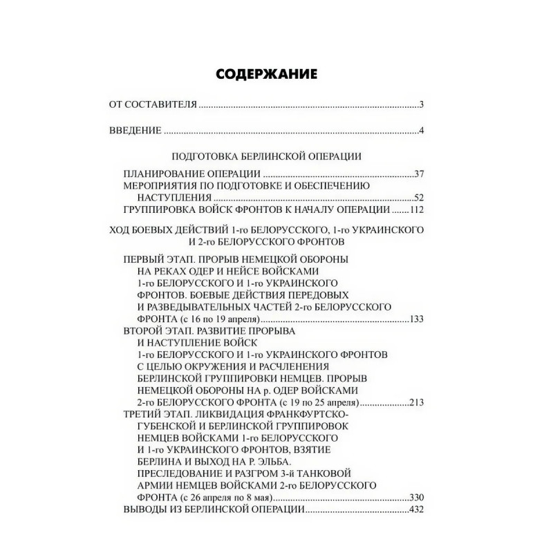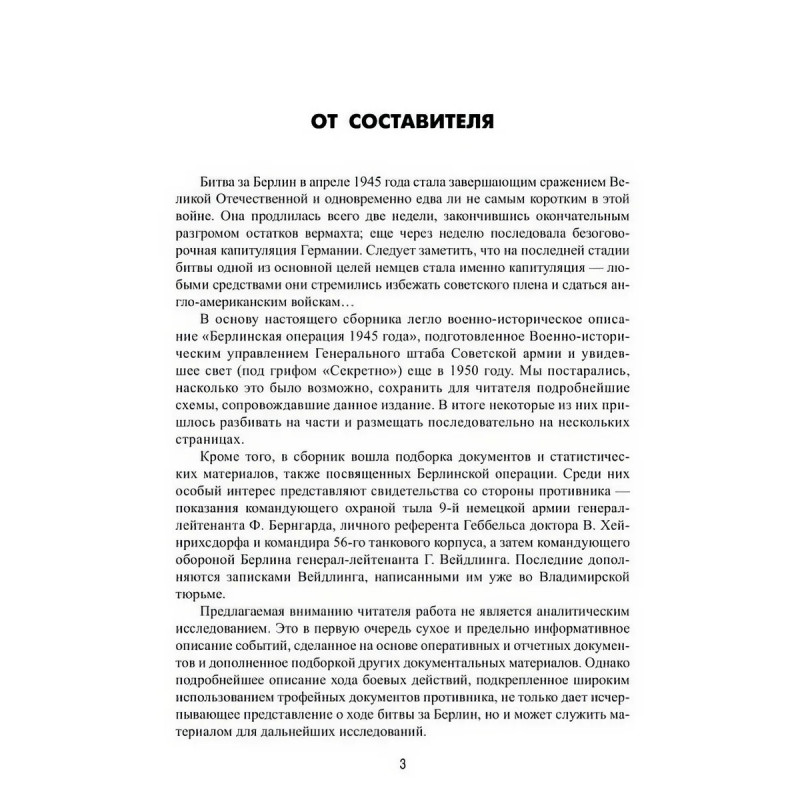 В основу настоящего издания легло исследование Военно-исторического управления Генерального штаба Советской армии о Берлинской операции апреля мая 1945 г При подготовке к публикации в этот труд военных историков была внесена некоторая литературная правка и сделаны незначительные сокращения В качестве приложений в книгу включены также свидетельства со сторо ны противника, подборка документов и статистических материалов и заимство-ванный из первоисточника комплект схем.