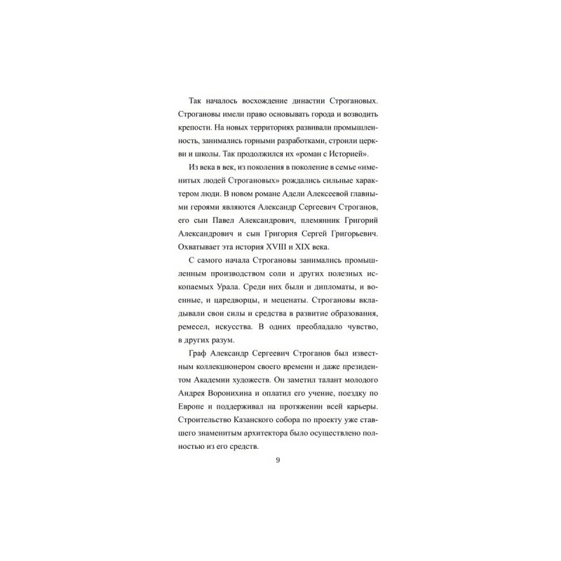 Перед вами роман-хроника о самых заметных представителях знаменитого рода Строгановых, живших в конце XVIII и в XIX столетиях. Один из Строгановых увлекся идеями французских философов и, поддавшись порыву бунтарства, даже стал членом якобинского клуба. Другой Строганов, человек широко образованный, слишком поддавался чувствам. Зато третий Строганов, на редкость разумный человек, очень рано поставил себе великую цель давать бесплатное образование талантливым российским юношам из простых семей и способствовать народному просвещению. Писатель Адель Алексеева-Созонова изучает русскую историю не по учебникам, а по документам, касающимся жизни представителей знаменитых русских династий. Беллетризованная форма повествований знаменитых русских династий. Беллетризованная форма повествований пробуждает большой интерес к русской истории.
