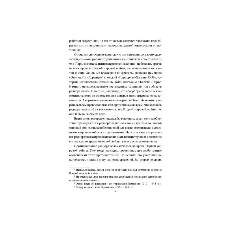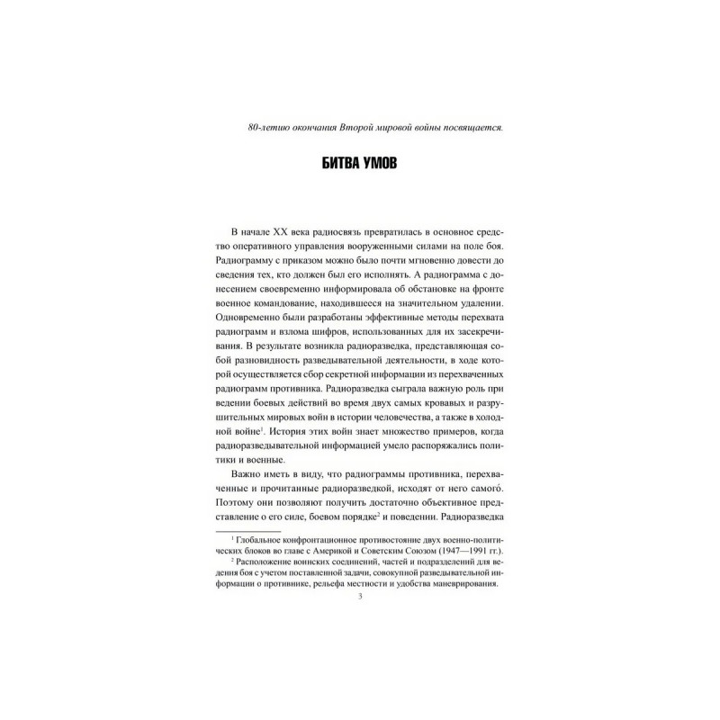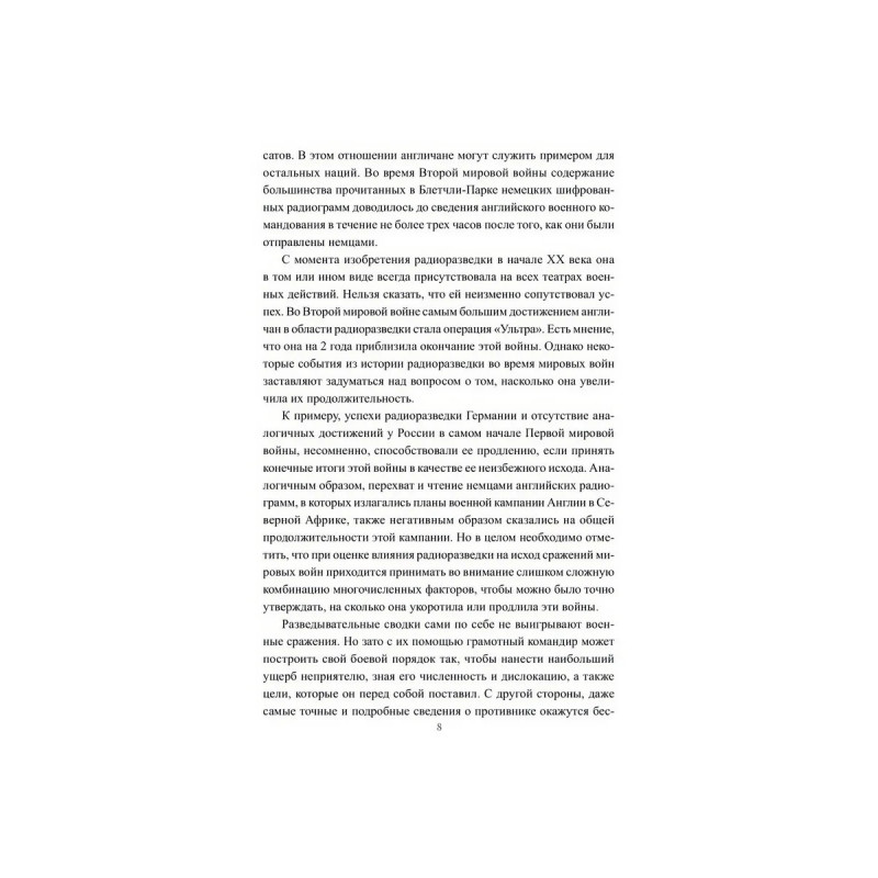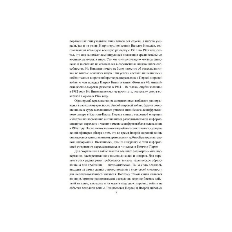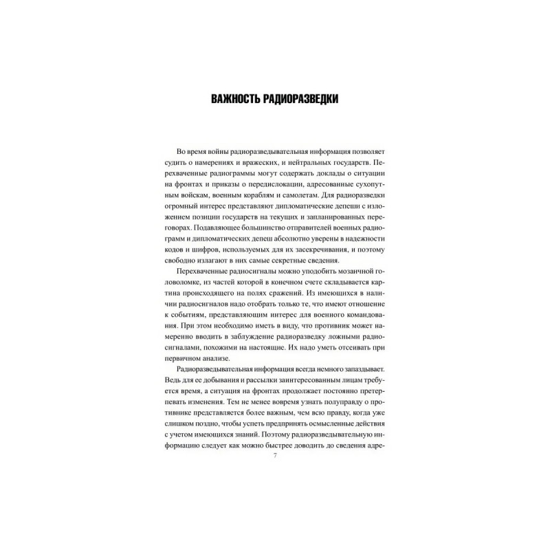 В начале XX века радиосвязь превратилась в основное средство оперативного управления вооруженными силами на поле боя. Радиограмму с приказом можно было почти мгновенно довести до сведения тех, кто должен был его исполнять. А радиограмма с донесением своевременно информировала об обстановке на фронте военное командование, находившееся на значительном удалении. Одновременно были разработаны эффективные методы перехвата радиограмм и взлома шифров, использованных для их засекречивания. В результате возникла радиоразведка, представляющая собой разновидность разведывательной деятельности, в ходе которой осуществляется сбор секретной информации из перехваченных радиограмм противника. Во время двух самых кровавых и разрушительных мировых войн в истории человечества, а также в холодной войне радиоразведка сыграла важную роль не только на полях сражений, но и в кабинетах государственных деятелей и дипломатов. Об этом рассказывает очередная книга серии.