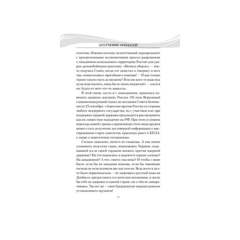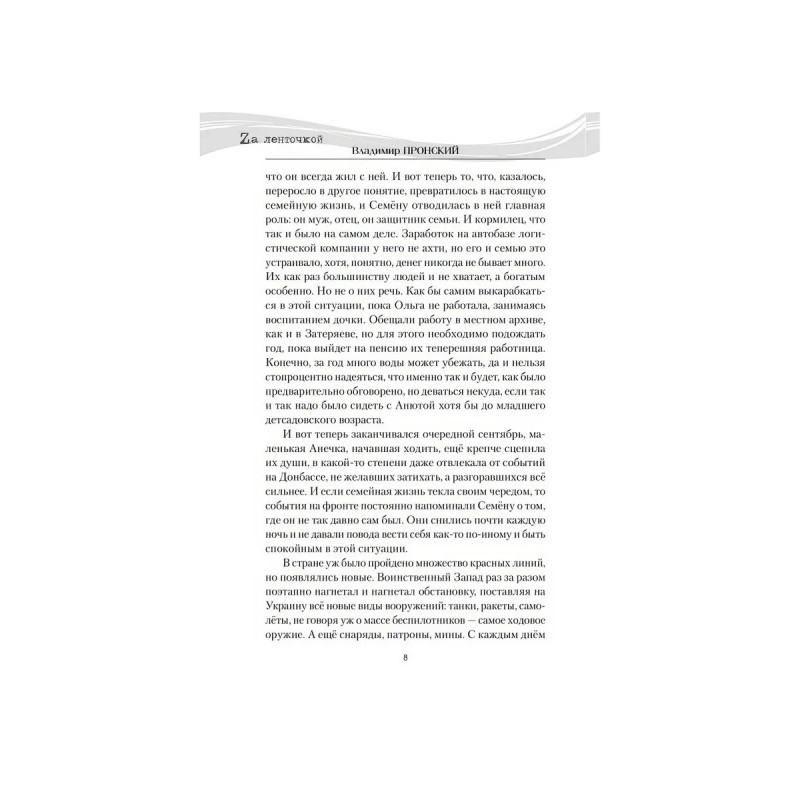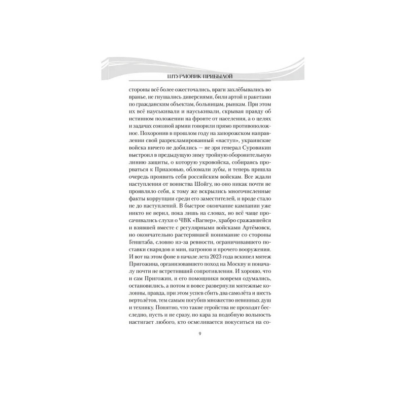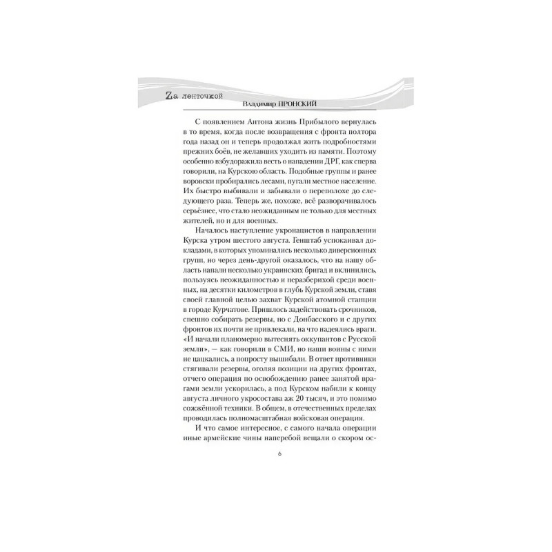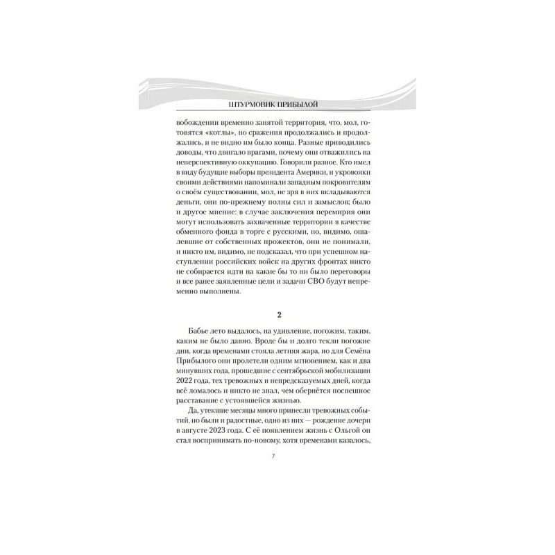 Новый роман Владимира Пронского Штурмовик Прибылой прямое продолжение ранее изданного романа Дыхание Донбасса. Главный герой Семён Прибылой, как только началась Специальная военная операция, ушел добровольцем защищать родную землю Донбасса. Когда же по возвращении из госпиталя вернулся к мирной жизни, пришло новое испытание: при защите семьи и чести малолетней дочери Семён вынужденно пошёл на преступление. Уже находясь под следствием, он снова проявил характер воспользовался возможностью избежать заключения и, подписав договор, в третий раз отправился за ленточку, теперь в составе штурмовой роты Шторм V.