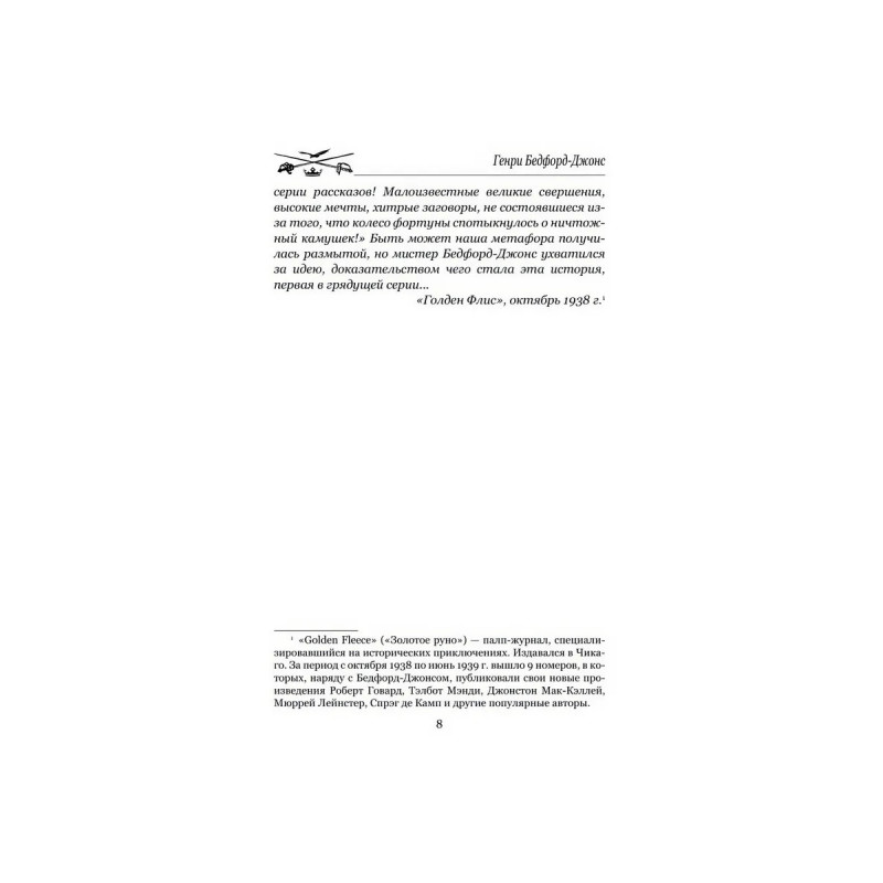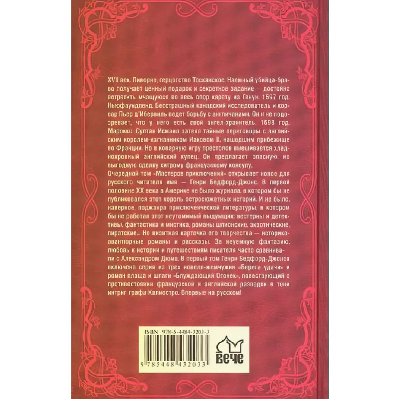 "XVIIвек. Ливорно, герцогство Тосканское. Наемный убийца-браво получает ценный подарок исекретное задание достойно встретить мчащуюся во весь опор карету из Генуи. 1697год. Ньюфаундленд. Бесстрашный канадский исследователь икорсар Пьер дИбервиль ведет борьбу сангличанами. Он ине подозревает, что унего есть свой ангел-хранитель. 1698год. Марокко. Султан Исмаил затеял тайные переговоры санглийским королем-изгнанником Иаковом II, нашедшим прибежище во Франции. Но вковарную игру престолов вмешивается хладнокровный английский купец. Он предлагает опасную, но выгодную сделку хитрому французскому консулу. Очередной том "Мастеров приключений" открывает новое для русского читателя имя Генри Бедфорд-Джонс. Впервой половине XXвека вАмерике не было журнала, вкотором бы не публиковался этот король остросюжетных историй. Ине было, наверное, поджанра приключенческой литературы, вкотором бы не работал этот неутомимый выдумщик: вестерны идетективы, фантастика имистика, романы шпионские, экзотические, пиратские... Но визитная карточка его творчества историко-авантюрные романы ирассказы. За неуемную фантазию, любовью кистории ипутешествиям писателя часто сравнивали сАлександром Дюма. Впервый том Генри Бедфорд-Джонса включена серия из трех новелл-жемчужин "Берега удачи" ироман плаща ишпаги "Блуждающий Огонек", повествующий опротивостоянии французской ианглийской разведки втени интриг графа Калиостро. Впервые на русском!"